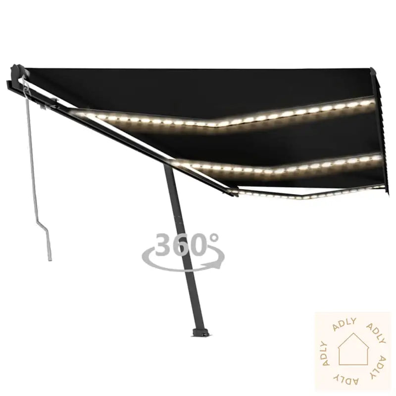 Den solide basen roterer 360 grader og gjør det mulig å tilpasse markisen helt etter ditt uterom. Markisen betjenes enkelt med fjernkontrollen som følger med, så du kan åpne eller trekke den inn uten å måtte reise deg. Du kan også bruke den lange håndsveiven for jevn manuell kontroll. En innebygd vindsensor gir ekstra trygghet og lukker automatisk markisen hvis det blir for mye vind. For kvelder ute har markisen integrerte LED-lamper som gir effektiv, energibesparende belysning – perfekt for å gjøre uterommet ekstra koselig sammen med dine hagemøbler.