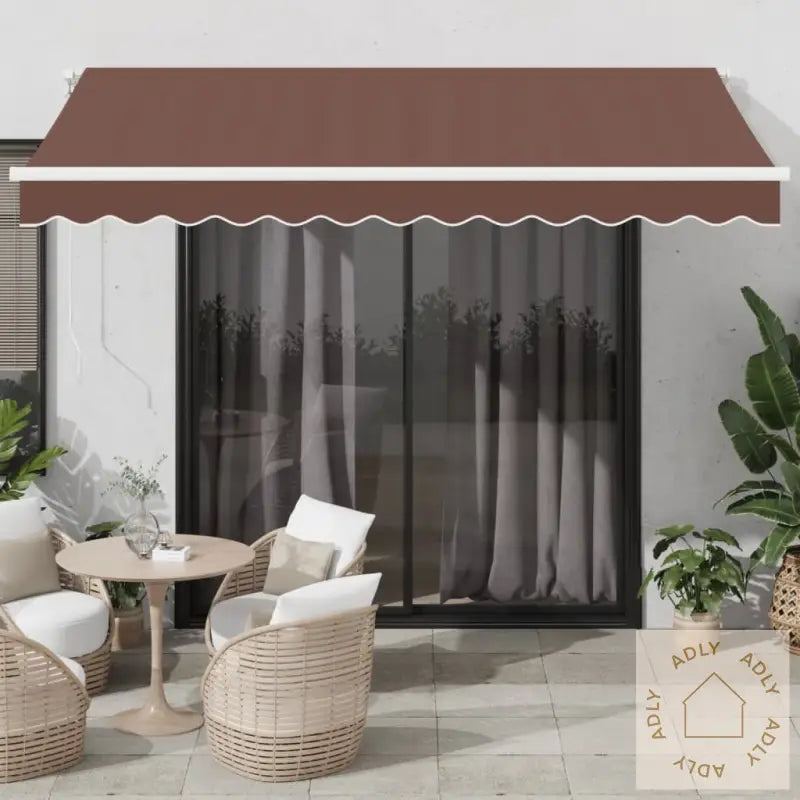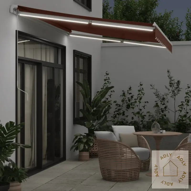 Vann- og UV-bestandig stoff: Markiseduken er produsert av polyester med høy tetthet og et slitesterkt PU-belegg. Dette gjør den både vannavstøtende, motstandsdyktig mot UV-stråler, og gir beskyttelse mot falming. Perfekt for deg som vil ha langvarige hagemøbler og en markise som holder seg pen over tid.Enkel i bruk: Du kan raskt justere vinkel og høyde, slik at skyggen alltid tilpasses dine behov, enten du slapper av alene eller har besøk. Med den praktiske langhånds-sveiven trekker du markisen ut og inn helt jevnt og enkelt.LED-lys: Når kvelden kommer, sørger de innebygde LED-lysene for deilig stemning på uteområdet ditt. Det gir en koselig og litt romantisk atmosfære, perfekt til middager, avslapping eller vennekvelder.Allsidig design: Denne uttrekkbare markisen har et stilrent uttrykk og passer rett inn uansett om det er hjemme eller i kommersielle omgivelser. Bruk den på balkong, terrasse, i hagen, til restauranter, kafeer, butikker og flere ulike steder der både møbler og funksjonell solbeskyttelse trengs.Stoffets farge: brunRammefarge: hvitMaterialer: Pulverlakkerte aluminiumprofiler kombinert med 100 % polyesterstoff med PU-belegg, noe som gir solid kvalitet og enkel rengjøring.Mål: 350 x 250 cm (L x B)Stoffet er vann- og smussavvisende, ideelt for det norske været.Markisen leveres med integrerte LED-lys (12 V) for ekstra komfort og stemning.Montering kreves