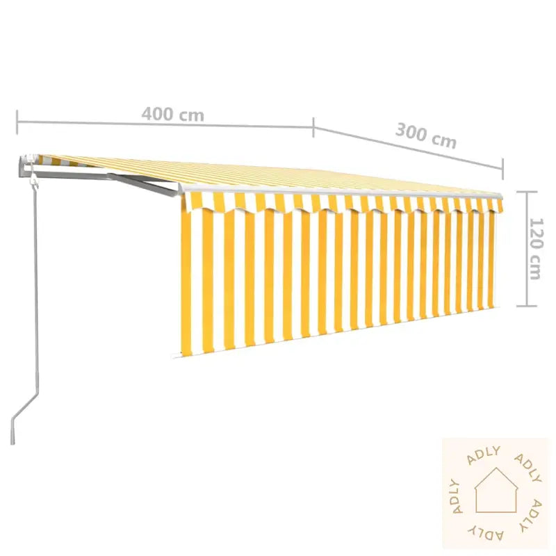 Farger: gul og hvitFarge ramme: hvitMaterialer: pulverlakkert aluminium, 100% polyesterstoff med PU-beleggMål markise: 400 x 300 cm (B x H)Mål rullegardin: 400 x 120 cm (B x H)Spenning: 230V~ , 0,68A; 50/60 HzEffekt: 155 WMoment: 20 NmHastighet: 13 rpmMontering kreves: ja