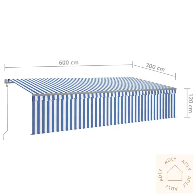 Farger: Blå og hvitFarge på ramme: AntrasittMaterialer: Pulverlakkert aluminium, 100% polyesterstoff med PU-beleggMål markise: 6 x 3 m (B x H)Mål rullegardin: 6 x 1,2 m (B x H)Spenning: 230V~, 0,95A; 50/60 HzEffekt: 226 WMoment: 40 NmHastighet: 13 rpmMontering kreves: ja
