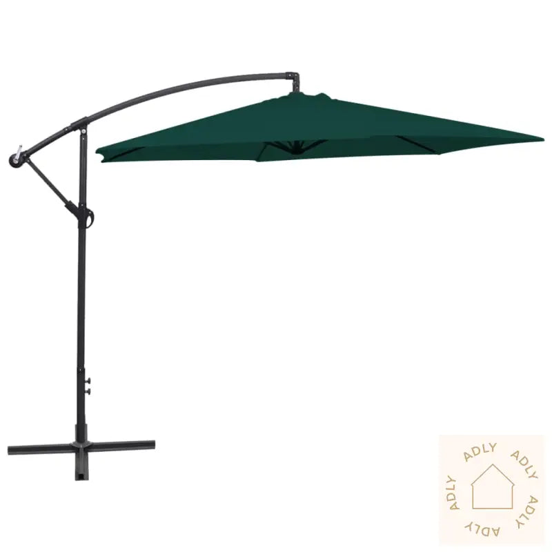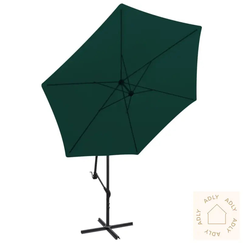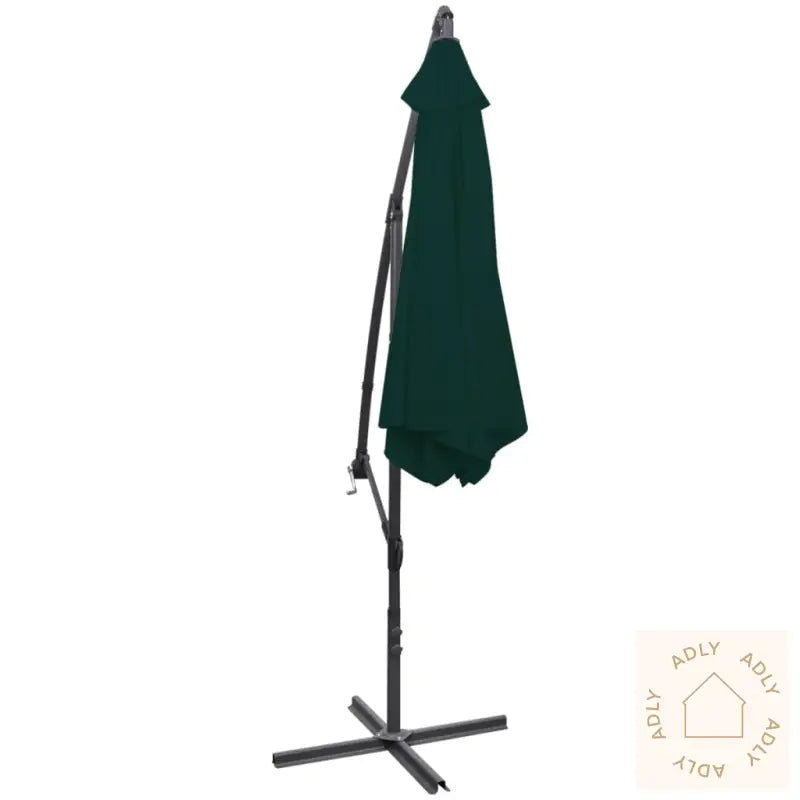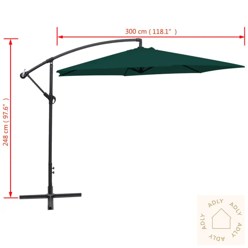 Skjermfarge: Solid grønnSkjermmateriale: PolyesterSkjermdiameter: 3 mHøyde: 2,48 mDiameter stang: 48 mmStangtykkelse: 0,8 mmMål kryssfot: 100 x 100 cm (L x B)Armaturmateriale: StålMed seks spilerEnkel ventilering (ingen klaff)Fritthengende designHengende parasoll med sveivVindtettGod ventilasjon og UV-beskyttelseStoff: Polyester: 100%