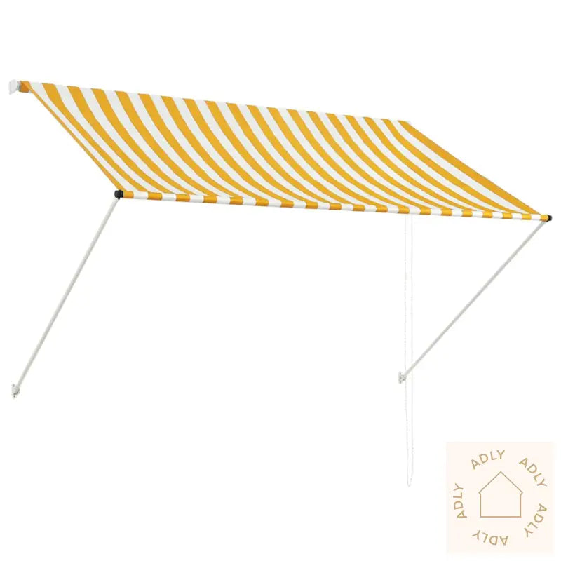 Farger: Gul og hvit – et friskt tilskudd til alle typer møbler eller utendørsmøbler.Materialer: Slitesterk stålramme og 100% polyesterstoff med PA-belegg.Vekt stoff: 180 g/m²Størrelse: 200 x 150 cm (B x H)Lengde uttrekkbar: 0 - 150 cmManuell betjening gjør det enkelt for alle å bruke den.Både UV- og vannbestandig, så den holder seg fin lenge.