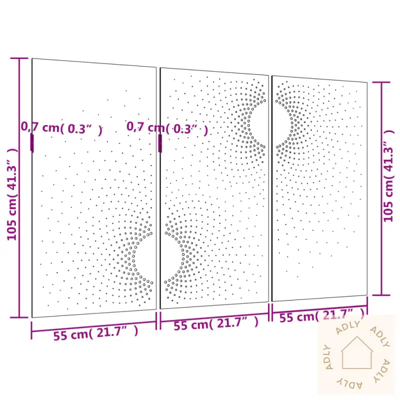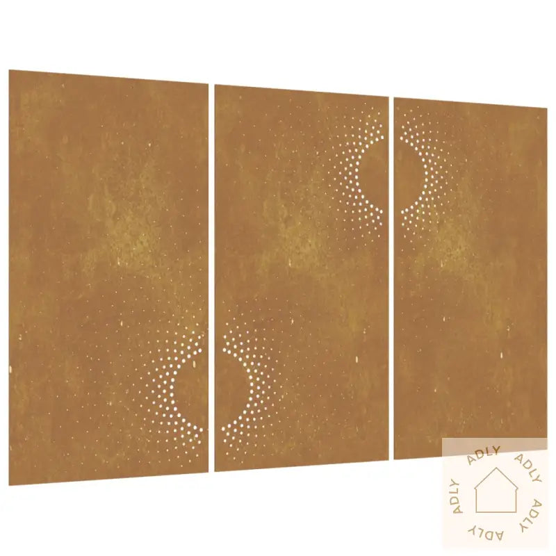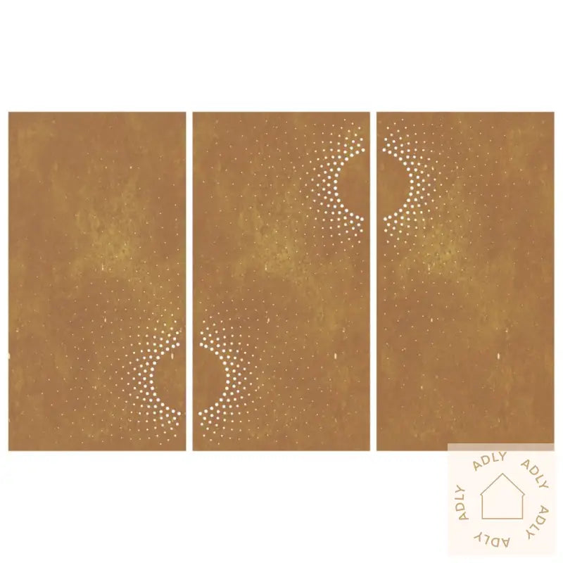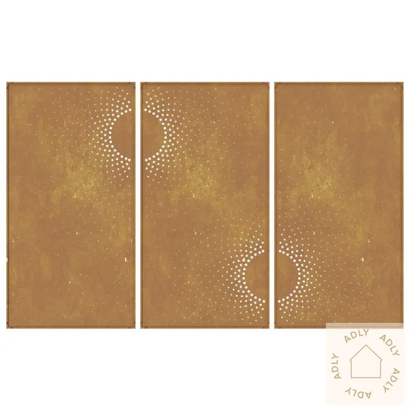 Produktet er ikke rustet ved levering, men får etterhvert en varm, rusten patina når det utsettes for vær og vind. Vil du ha det autentiske rustutseendet raskt, kan du enkelt fremskynde prosessen med litt såpevann og saltvann. For å unngå flekker på klærne mens rustlaget utvikles, bør du være forsiktig med direkte berøring.Farge: RustenMateriale: Forhåndsrustet stål (Cortenstål)Mål: 105 x 55 x 0,7 cm (L x B x T)Leveransen inneholder:3 x veggdekorasjoner til hage