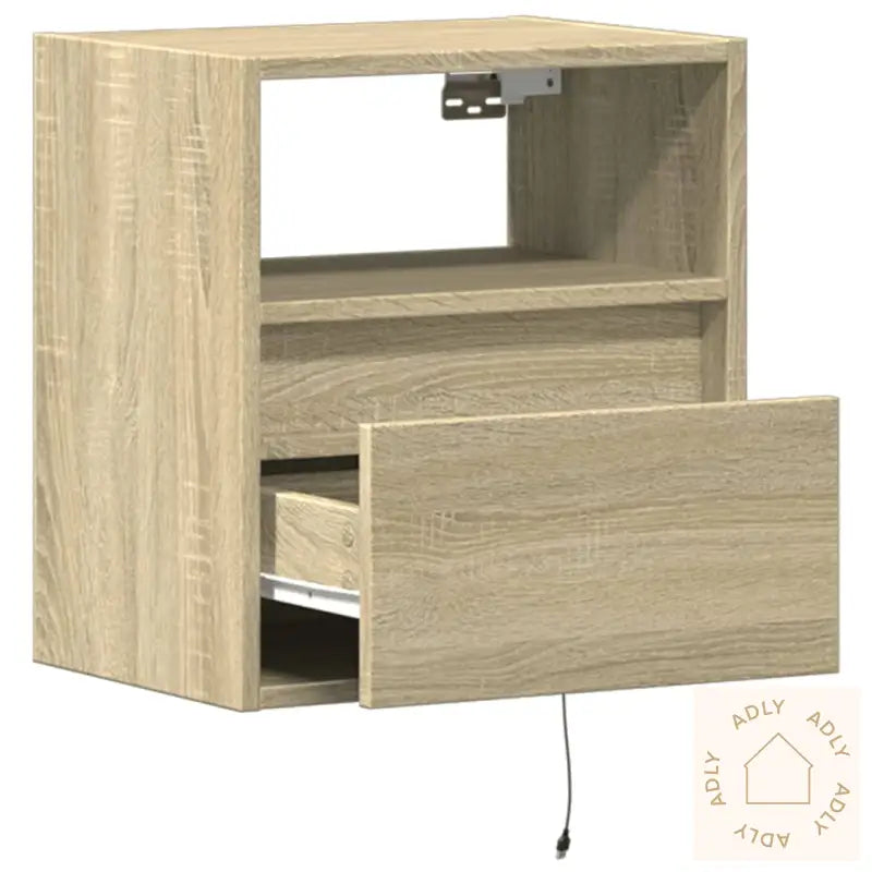 Oppgrader soverommet ditt med dette veggmonterte nattbordet i sonoma eik, komplett med justerbare LED-lys! Dette moderne nattbordet passer sømløst inn med ulike møbler til hjemmet, og tilfører et behagelig og stilrent preg.