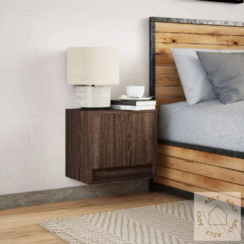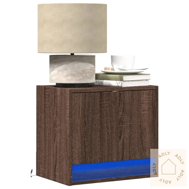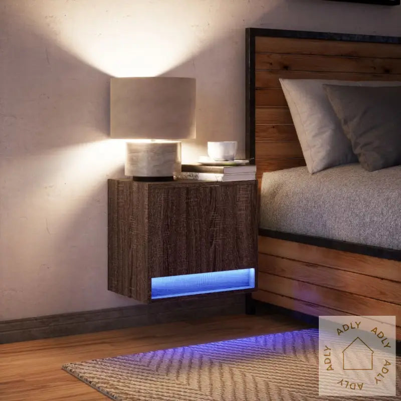 Oppgrader soverommet ditt med dette stilige, veggmonterte nattbordet i brun eik med innebygde LED-lys! Dette moderne nattbordet passer perfekt inn sammen med øvrige møbler til hjemmet og tilfører både funksjon og eleganse til rommet.