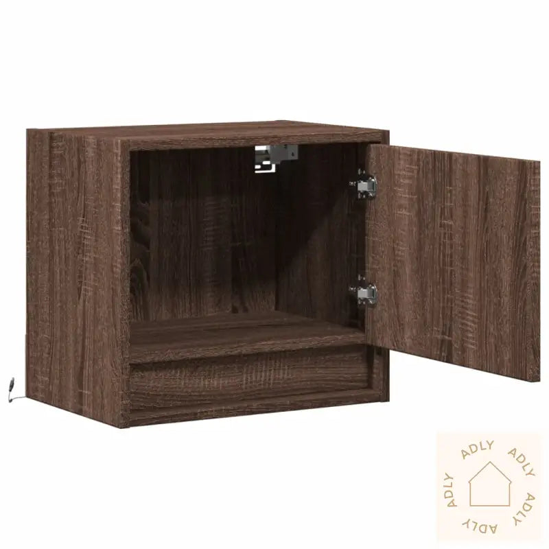 Skruer og plugger for innvendige vegger følger ikke med. For best resultat, bruk festemidler som passer til din veggtype. Er du usikker, anbefales det å søke råd hos fagfolk, og alltid følge instruksjonene nøye.Nattbordet har USB-kontakt for LED-lysene, og krever en 5V USB-strømkilde (følger ikke med).Farge: brun eikMateriale: konstruert treMål: 45 x 31 x 40,5 cm (L x B x H)Antall skuffer: 1Med LED-lysMontering kreves: jaDen varme brun eik-fargen gir nattbordet et tidløst uttrykk som enkelt kan kombineres med både moderne og klassiske møbler til hjemmet. Dette praktiske og elegante nattbordet gjør det lett å sette et personlig preg på soverommet, samtidig som du får et funksjonelt møbel du kan ha glede av lenge.