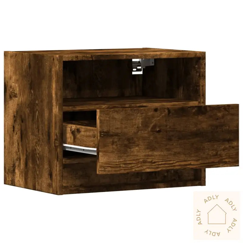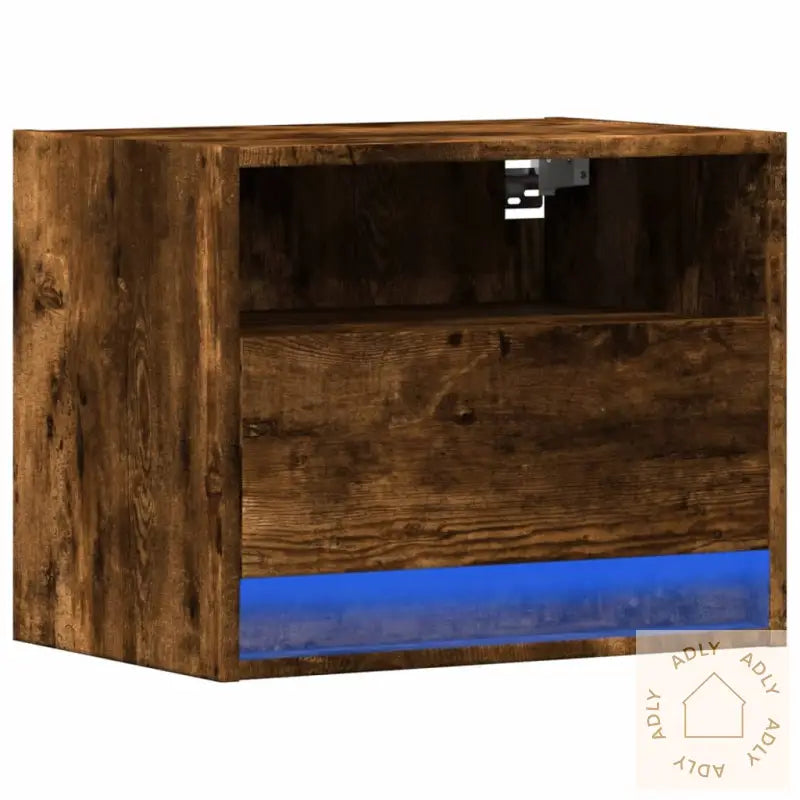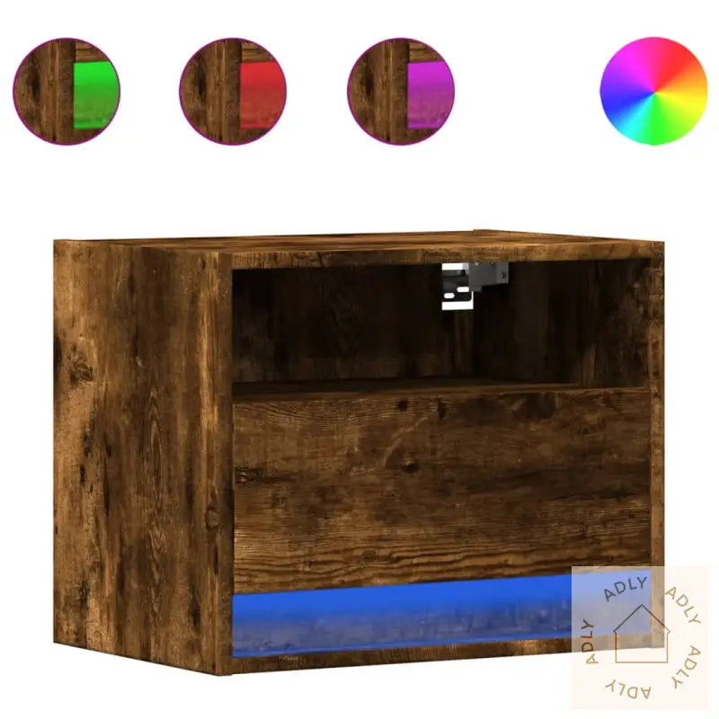 Skruer og plugger for innvendig vegg følger ikke med. Velg alltid festemateriell som passer til akkurat din veggtype. Er du usikker, spør en fagperson. Følg monteringsinstruksjonene nøye for best mulig resultat.LED-belysningen styres via USB. Du trenger en sertifisert 5V USB-strømkilde (denne er ikke inkludert).Farge: Røkt eikMateriale: Konstruert treMål: 50 x 34 x 40 cm (L x B x H)Antall skuffer: 1Med LED-lysMontering kreves: ja