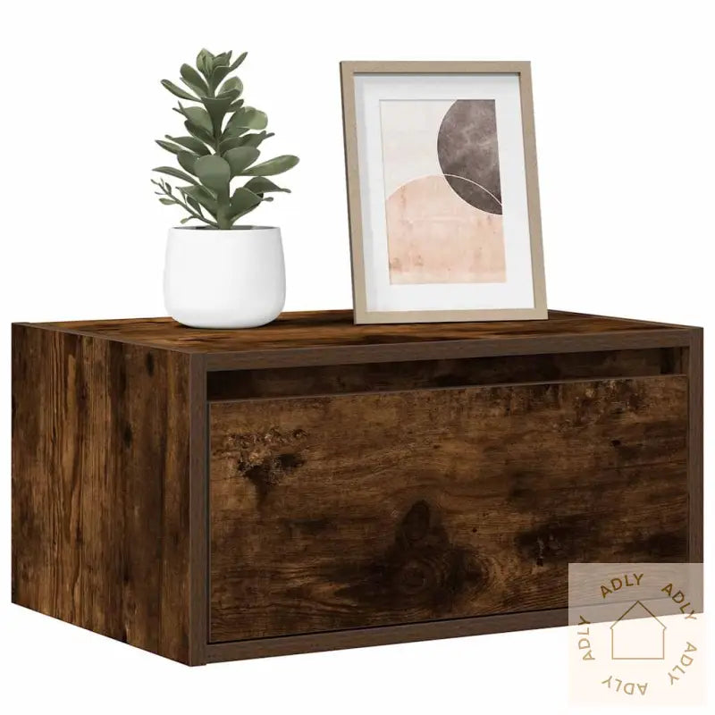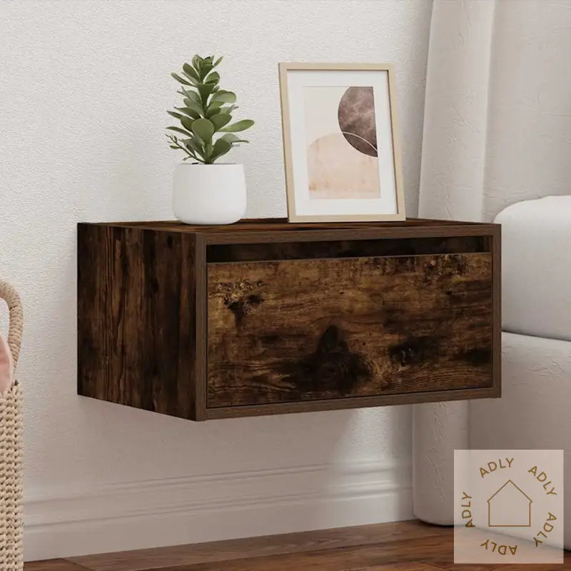 Skruer og plugger til veggmontering følger ikke med. Velg skruer og plugger som passer for akkurat dine vegger, og spør gjerne en profesjonell hvis du er usikker. Les alltid monteringsinstruksjonene nøye før montering.Nattbordet har en USB-kontakt – denne krever en sertifisert 5V USB-strømkilde (ikke inkludert).Farge: Røkt eikMateriale: Konstruert treSamlet mål: 51 x 35,5 x 25 cm (B x D x H)Mål skuff: 47 x 28,5 x 19 cm (B x D x H)Montering kreves: ja