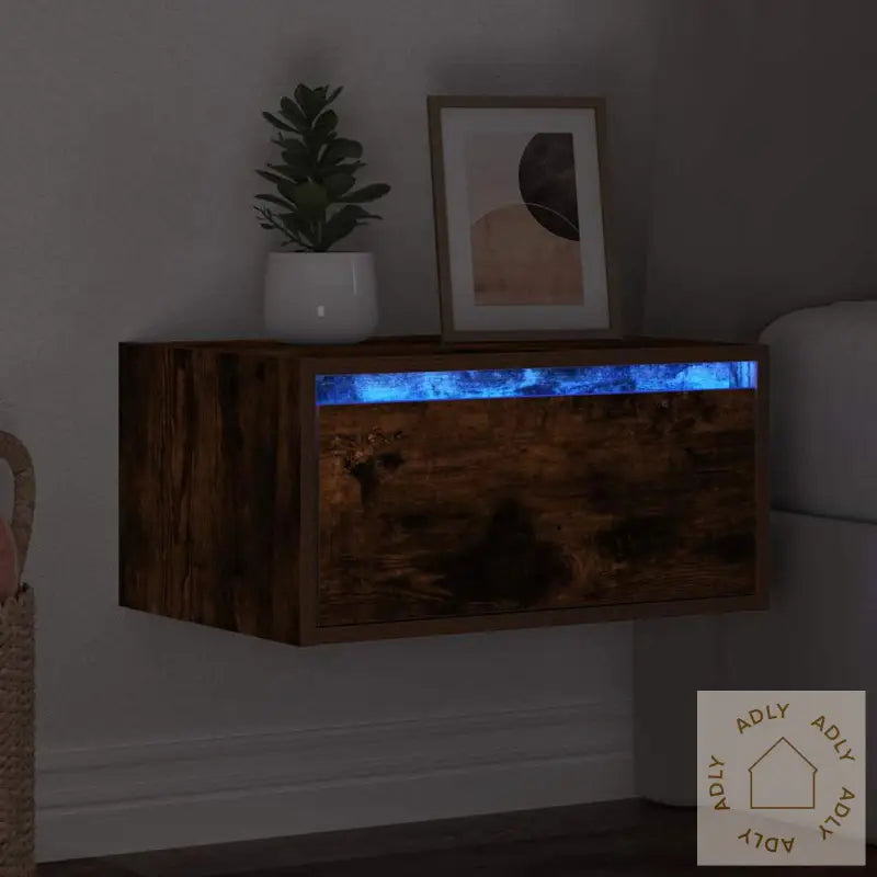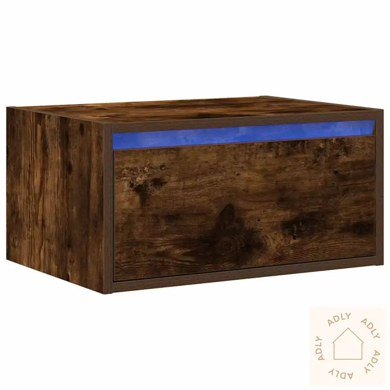 Stabilt og slitesterkt materiale: Nattbordet er laget av konstruert tre, kjent for sin styrke og solide overflate. Materialet gir et holdbart møbel som tåler daglig bruk, hindrer fuktighet og forhindrer vridning over tid. Dette gjør nattbordet til et trygt valg om du verdsetter pålitelige møbler til hjemmet som varer lenge.Rikelig med lagringsplass: Du får god plass til å organisere bøker, magasiner, briller eller annet nødvendig for en avslappende kveld. Den romslige skuffen sørger for at tingene dine er lett tilgjengelig, samtidig som de holdes ute av syne for et ryddig uttrykk.RGB LED-lys for stemningsfull belysning: Med de integrerte LED-lysene er det enkelt å justere både farger og lysstyrke etter humøret ditt. Om du ønsker mykt lys for avslapning eller sterkere belysning mens du leser, kan du tilpasse det for en hyggelig atmosfære på soverommet. Skap et personlig lysshow og løft interiøret ditt med et lekent og moderne preg.Veggmontert og plassbesparende: Det flytende designet gjør at nattbordet monteres rett på veggen, sånn at du frigjør gulvplass og får et mer åpent og rent rom. Det er smart for deg som vil ha et praktisk møbel som også tar hensyn til romfølelsen.Solid topp for dekor og nødvendigheter: Den robuste toppen gir godt med plass for bordlampe, vekkerklokke, bilderammer, små potteplanter, dekorasjoner eller annet nødvendig du liker å ha i umiddelbar nærhet til sengen.Godt å vite: