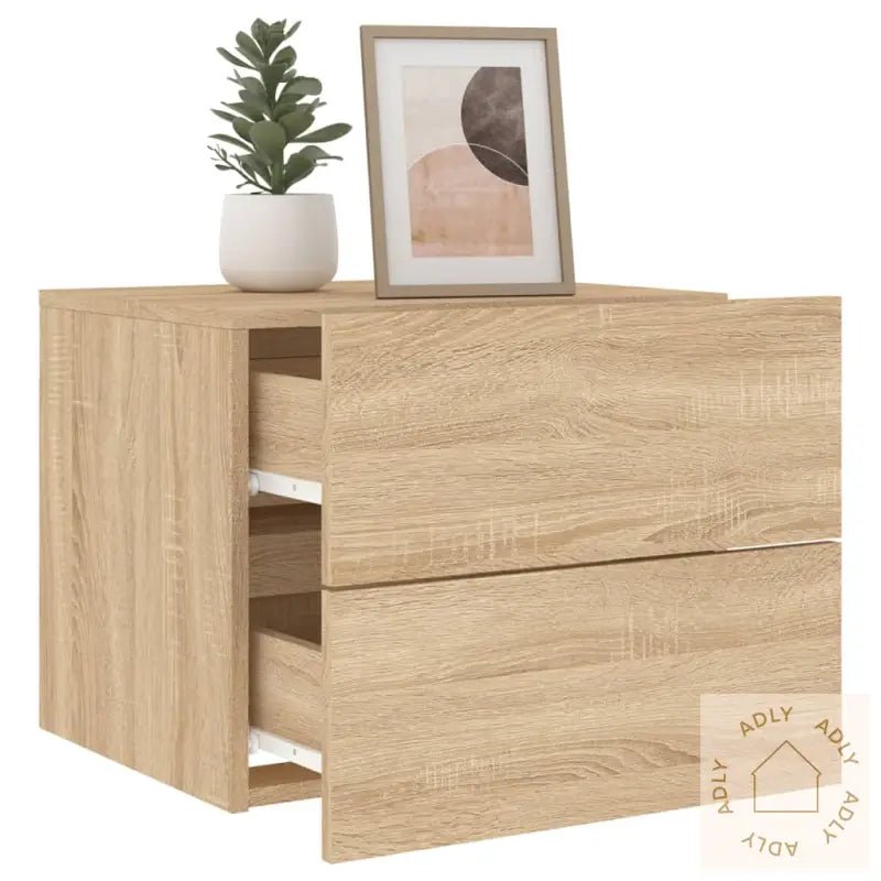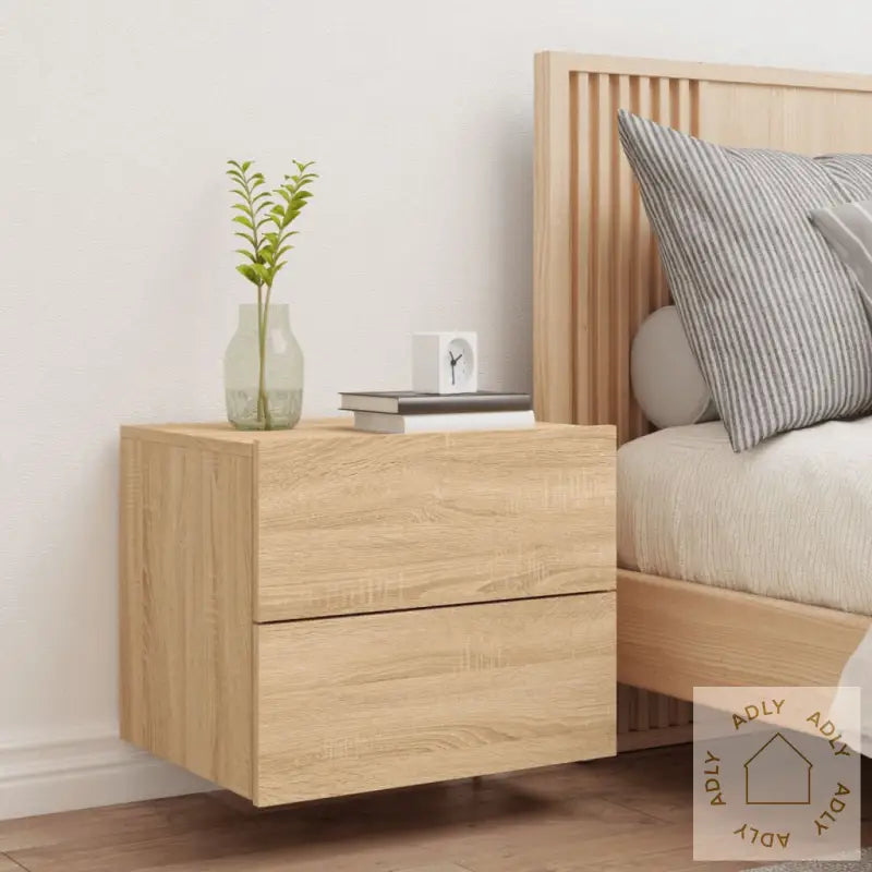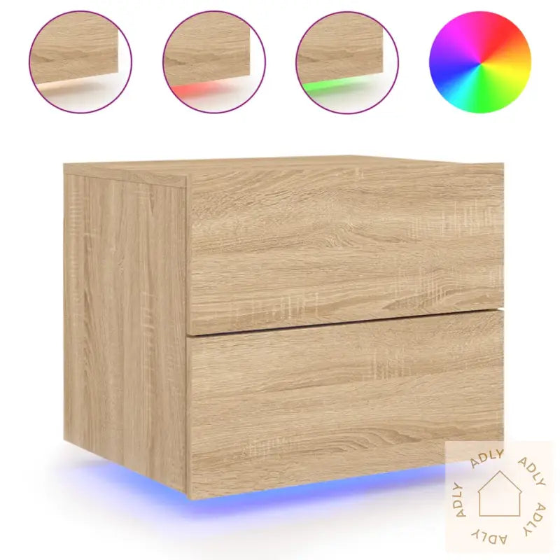 Slitesterkt materiale: Laget av konstruert tre i sonoma eik, er dette nattbordet solid, stabilt og fuktresistent. Overflaten er glatt og enkel å holde ren, noe som gjør det til et praktisk valg for daglig bruk.Stemningsskapende RGB LED-lys: Nattbordet er utstyrt med levende RGB LED-lys som du kan justere etter humør og stil. Velg farger og lysinnstillinger via tilpassbare menyer, eller sett lyset på automatisk endring for ekstra stemning på soverommet. LED-lysene gir ikke bare funksjonell belysning, men også et trendy og oppdatert uttrykk.Spar plass med veggmontering: Det flytende skapet monteres direkte på veggen. Perfekt for små rom hvor du vil utnytte hver kvadratmeter, eller for deg som ønsker å ha gulvet fritt for møbler. Dette gjør rengjøringen enklere og gir soverommet et minimalistisk preg.Flerfunksjonelt møbel: Veggmonterte nattbordet passer perfekt til bøker, dekor, klokker eller andre småting du må ha i nærheten av sengen. Du kan også bruke det som en del av en helhetlig interiørløsning, og det tilfører enkelt ekstra lagringsplass der du trenger det mest.Godt å vite: