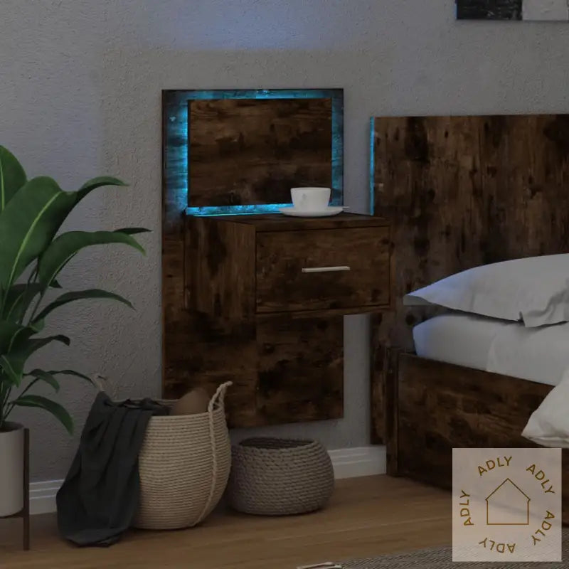 Det er laget av konstruert tre av høykvalitet, kjent for sin glatte overflate, styrke, gode stabilitet og motstandsdyktighet mot fukt – så dette nattbordet tåler daglig bruk.Takket være det veggmonterte, flytende designet sparer du virkelig mye gulvplass. Nattbordet henger trygt på veggen og gir ekstra oppbevaringsplass – ideelt for deg som har litt mindre plass eller bare ønsker et mer ryddig soverom.Innebygde LED-lys gir et moderne preg og sørger for behagelig lyssetting. Disse forbedrer det trendy uttrykket og gjør nattbordet til et elegant blikkfang når du vil skape stemning på soverommet.Den robuste bordplaten er perfekt for pynteting, bilderammer eller små planter, så du kan enkelt sette ditt personlige preg på rommet.Siden overflaten er glatt, er nattbordet superlett å holde rent. Det holder lenge med en kjapp tørk med en fuktig klut, noe som gjør vedlikeholdet minimalt.Godt å vite:
