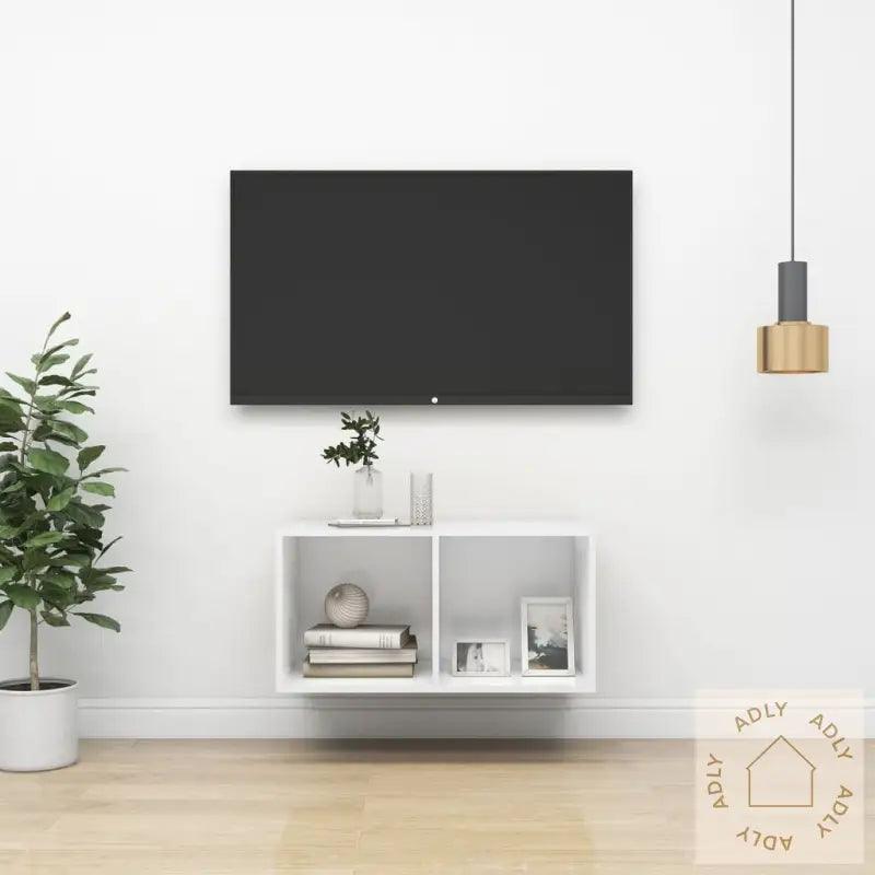 Denne veggmonterte TV-benken gir deg masse oppbevaringsplass til å organisere alt fra elektronikk til bøker, pynt og andre favoritter. Den passer perfekt som et stilig og funksjonelt møbel til hjemmet ditt, og vil garantert trekke blikket mot seg med sitt moderne hvite design.
