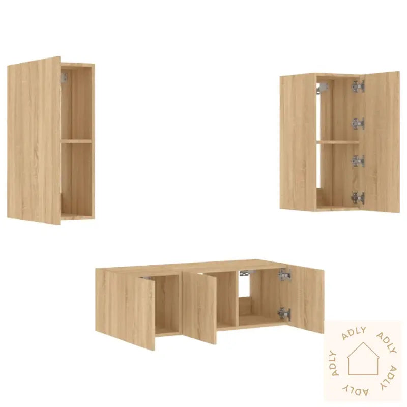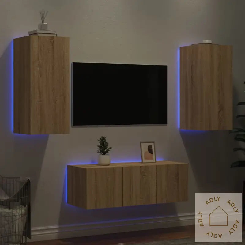 Solid materiale: Enhetene er laget av konstruert treverk i høy kvalitet, med en jevn, lettstelt overflate. Dette gir ikke bare styrke og stabilitet, men gjør også møblene motstandsdyktige mot fukt og daglig bruk.RGB LED-lys: Alle TV-enhetene har innebygde RGB LED-lys som gir en kul og moderne stemning. Du kan enkelt tilpasse lysets farge og modus via forskjellige menyer, og til og med sette lysene til å skifte automatisk. RGB LED-lys gir den vegghengte TV-benken en eksklusiv look, og gjør den til et naturlig blikkfang.Veggmontert design: Den vegghengte tv-benken monteres rett på veggen – det gir fri gulvplass og gjør rengjøring enklere. Du får samtidig oversikt og orden på rommet ditt.Rikelig med lagringsplass: Med flere romslige hyller og skap gir disse TV-enhetene deg plass til alt fra bøker, magasiner og dekodere, til medieutstyr og annet du vil ha lett tilgjengelig. Alt holdes pent organisert og innen rekkevidde.Allsidig og fleksibel: De vegghengte enhetene i sonoma eik passer like godt i stua som på hjemmekontoret eller soverommet. Bruk dem som vegghengt tv-benk under TV’en, eller til praktisk oppbevaring av verktøy og andre ting – perfekt for å skape litt ekstra orden og samtidig løfte interiøret.Godt å vite: