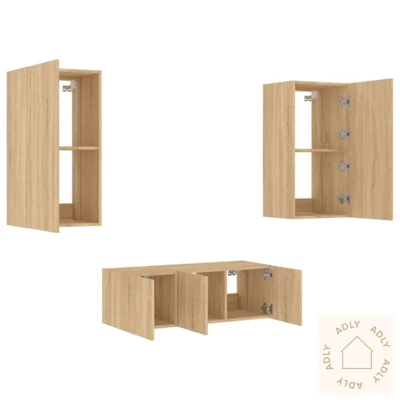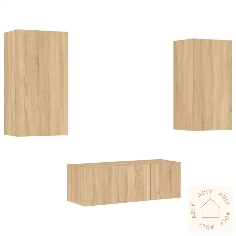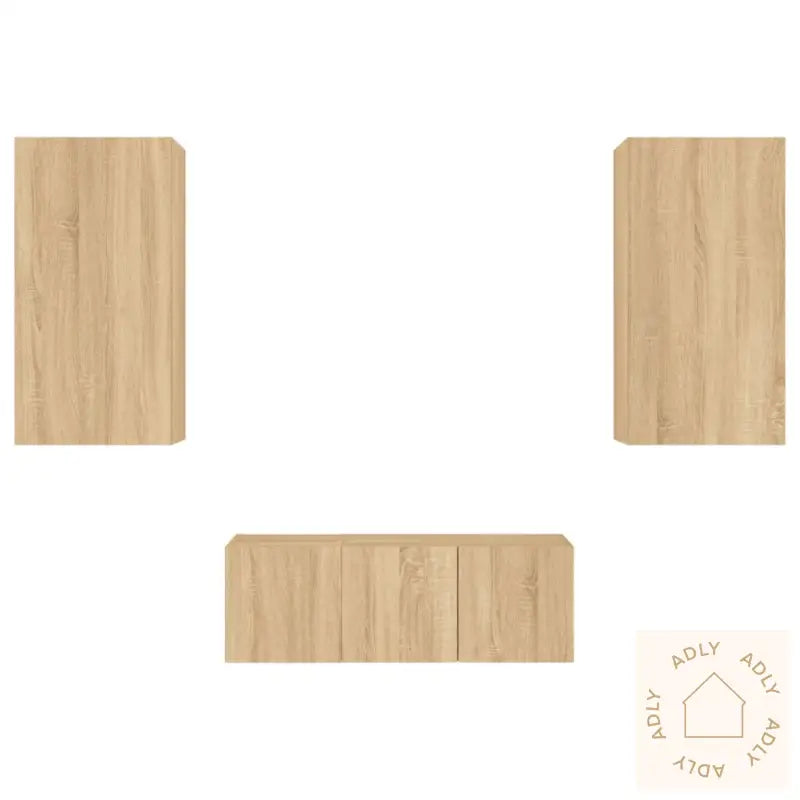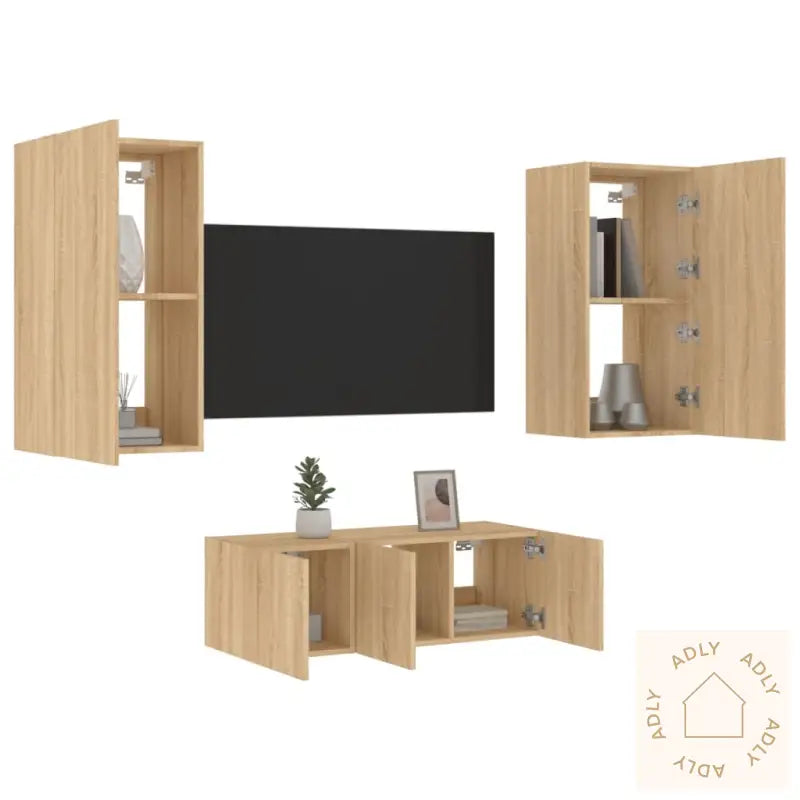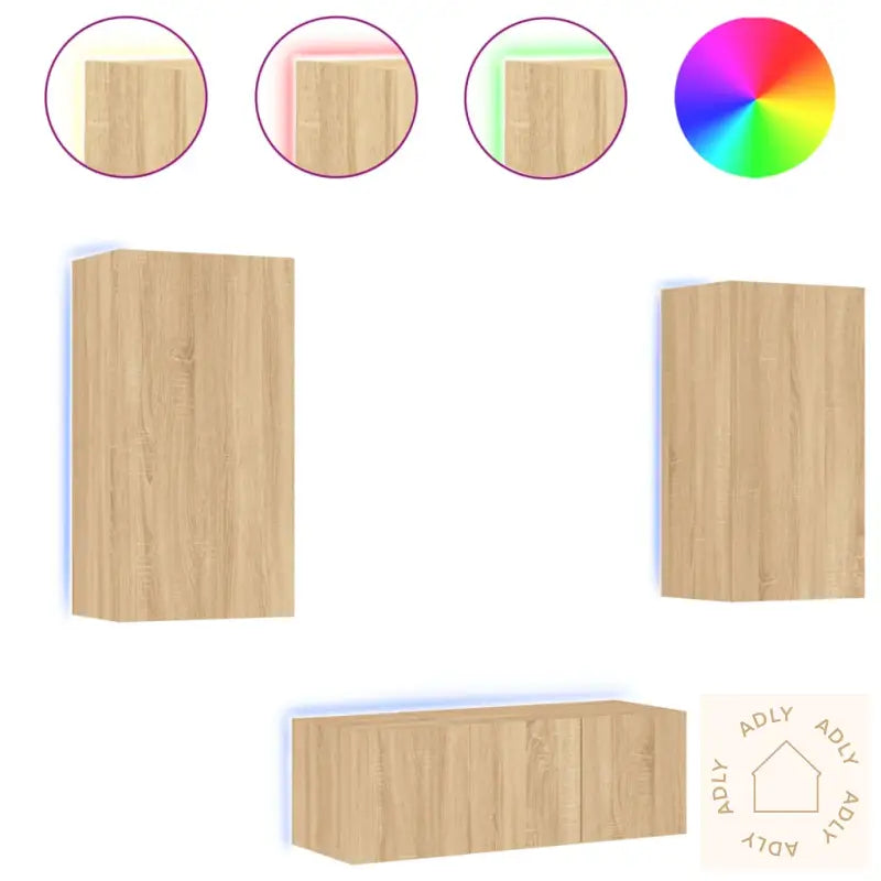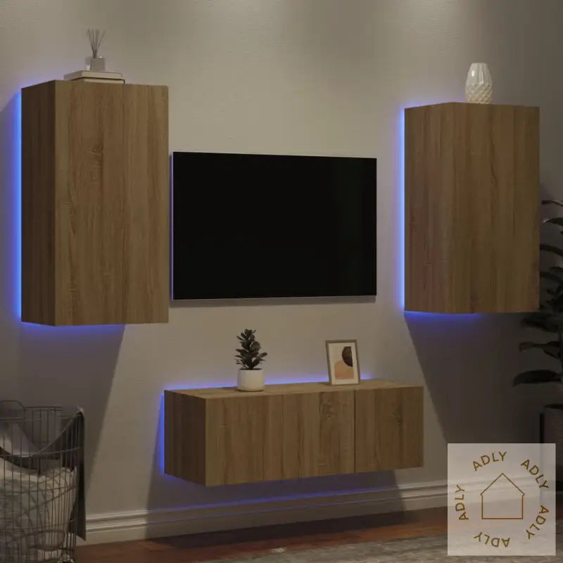 Solid materiale: Den vegghengte TV-benken og tilhørende skap er laget av konstruert tre av høy kvalitet, med en jevn og stilfull overflate. Materialet gir ikke bare lang holdbarhet og god stabilitet, men tåler også fuktighet godt – perfekt for nordiske hjem.RGB LED-lys: Sett stemningen med fargerike RGB LED-lys som gir et friskt og moderne uttrykk. Du kan enkelt endre mellom ulike lysfarger og -moduser via et tilpassbart menyvalg, slik at belysningen matcher stemningen eller innredningen – enten det er filmkveld eller hverdagskos. De integrerte LED-lysene gjør at veggskapene skiller seg ut og løfter helhetsinntrykket av stuen.Veggmontert design: Løsningen monteres direkte på veggen, slik at du slipper å bruke unødvendig gulvplass. Dette gir ikke bare en ryddigere look, men gjør også rengjøringen enklere og lar deg utnytte rommet bedre.Rikelig lagringsplass: Samtlige vegghengte TV-benker gir god plass til å organisere ting du bruker ofte, som bøker, fjernkontroller, DVD-er, magasiner eller spillkonsoller. Alt har sin faste plass, og favorittgjenstandene dine er alltid lett tilgjengelige.Allsidig design: Vegghengt TV-benk i sonoma eik fungerer perfekt både som TV-møbel hjemme og som praktisk oppbevaringsløsning for kontor eller arbeidsrom. Den forvandler en ellers tom vegg til et stilig og funksjonelt oppbevaringsområde.Godt å vite: