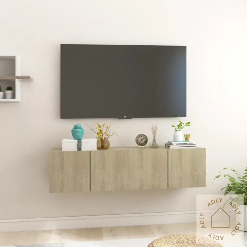 Dette hengende TV-benksettet i sonoma eik gir stua din et moderne og minimalistisk preg, samtidig som det fungerer som et flott blikkfang blant dine møbler til hjemmet. Med sitt slanke design utnytter benken plassen effektivt, enten den monteres under TV-en eller på en ledig vegg. Hvert av de to skapene har 2 rom hver, så du får rikelig med plass til å organisere blader, DVD-er, elektronisk tilbehør eller annet du ønsker å holde pent samlet. Dette gir god oversikt, samtidig som rommene gjør det enkelt å holde stua ryddig og stilren.