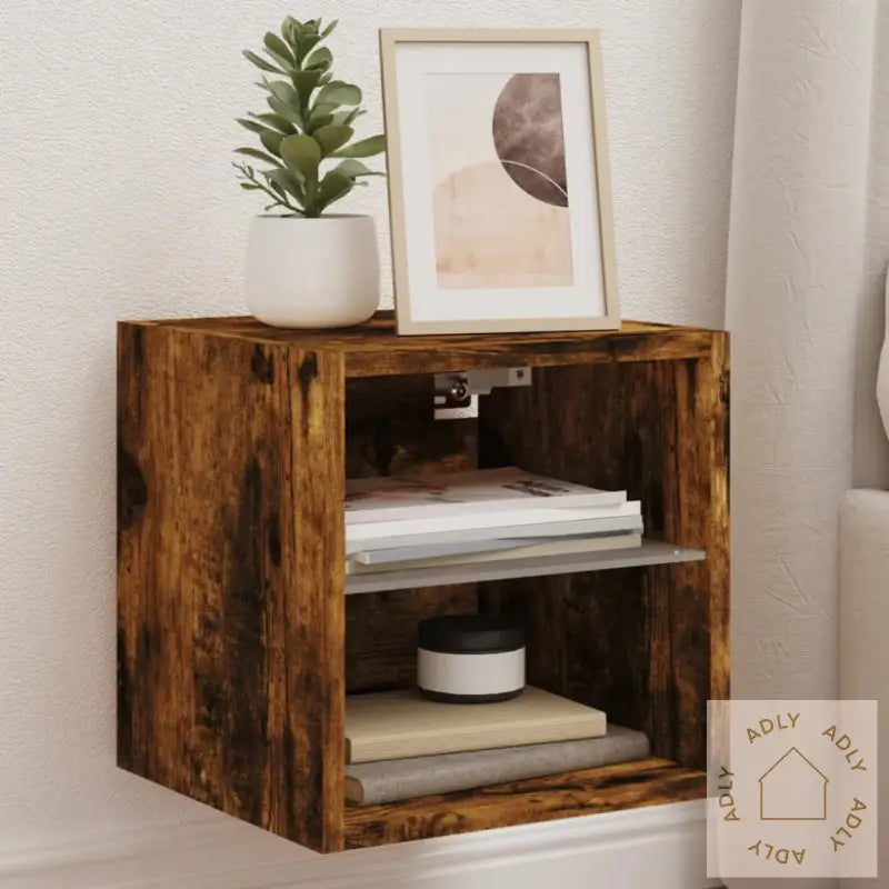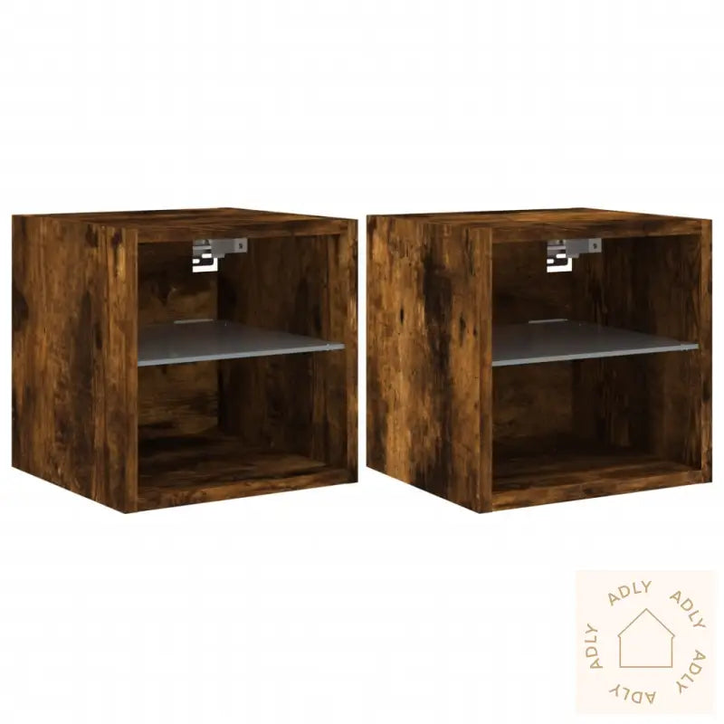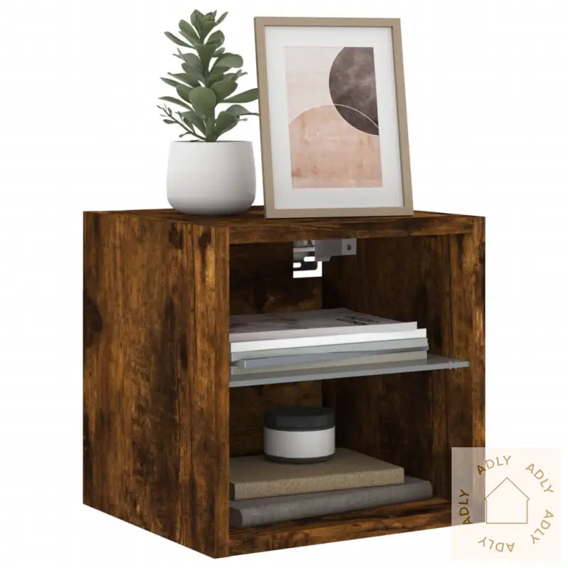 Skruer og plugger for montering følger ikke med, så husk å bruke festemidler som passer til akkurat dine vegger. Rådfør deg gjerne med fagfolk om du er usikker. Følg alltid monteringsanvisningen nøye.Produktet har USB-kontakt for RGB LED-lysene, og du trenger en sertifisert 5V USB-strømkilde (følger ikke med).Farge: røkt eikMateriale: konstruert treMål: 30 x 28,5 x 30 cm (B x D x H)Mål rom: 27 x 28,5 x 13,5 cm (B x D x H)Med glasshylleMontering kreves: jaLeveransen inneholder:2 x veggmonterte TV-benker