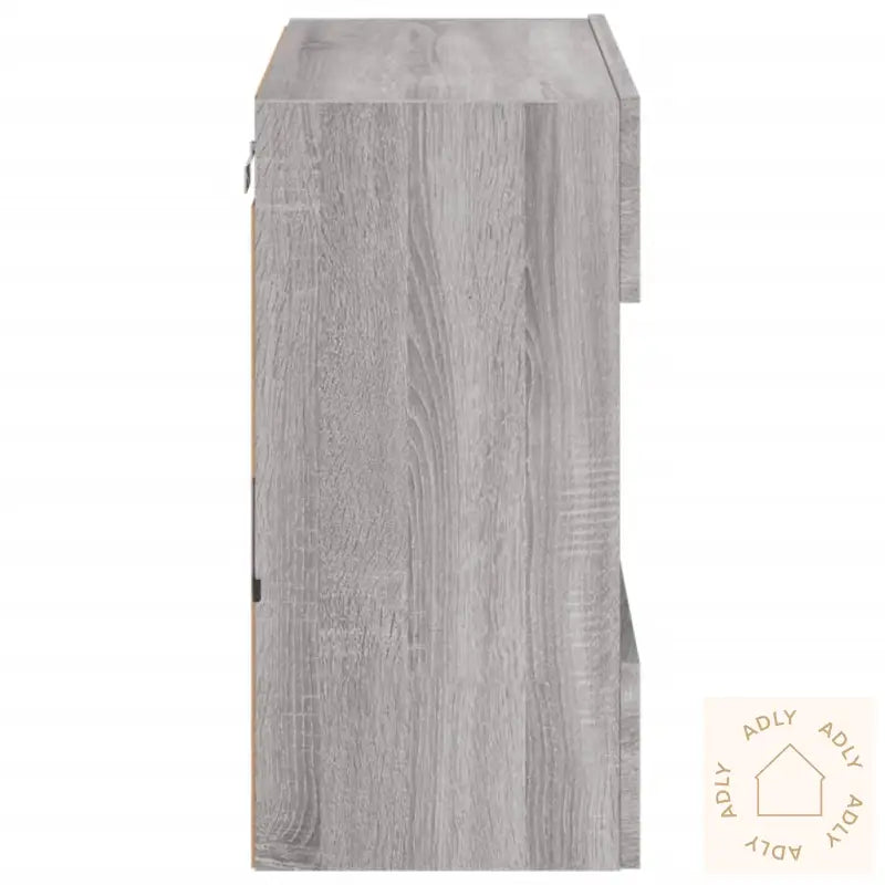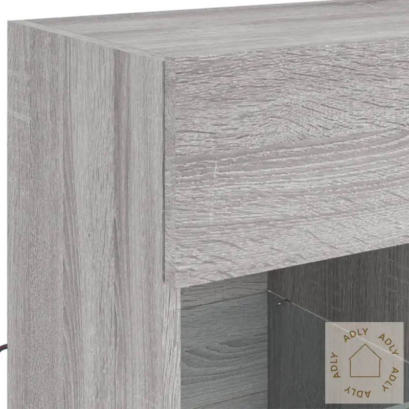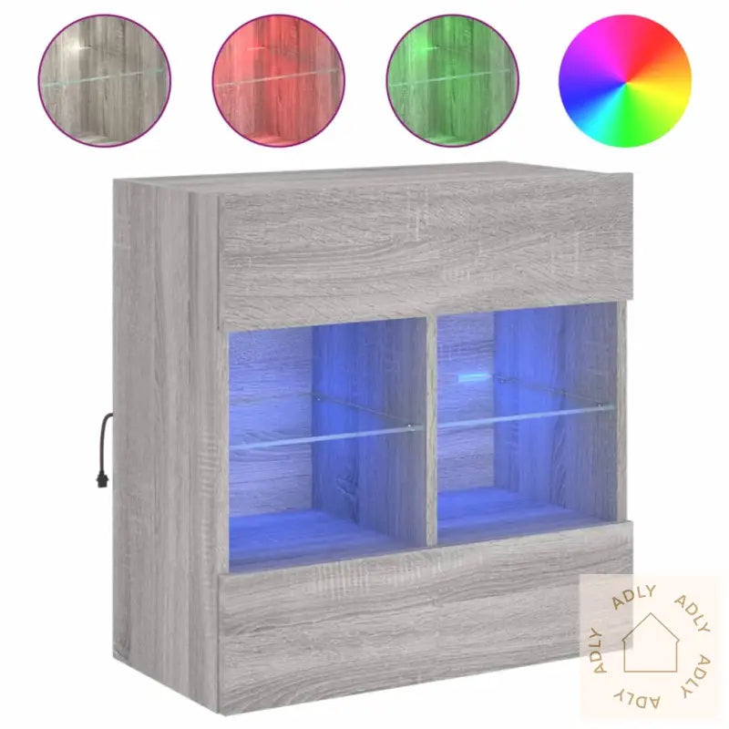 Skruer og plugger for veggmontering følger ikke med. For et trygt og sikkert resultat anbefaler vi at du finner riktig skruer og plugger for dine vegger, og eventuelt tar kontakt med fagfolk om du er usikker. Følg alle monteringsanvisninger nøye.Produktet er utstyrt med USB-kontakt som krever en sertifisert 5V USB-strømkilde (ikke inkludert).Farge: grå sonoma, en tidløs nyanse som passer de fleste interiører.Materiale: konstruert tre, solid og holdbart.Mål: 58,5 x 30 x 60,5 cm (B x D x H).Mål rom: 27 x 28,5 x 14 cm (B x D x H).Med 2 glasshyller for ekstra stil og visning av pynt eller duppeditter.Montering kreves: ja.Oppgrader stua eller soverommet med denne allsidige TV-benken med RGB LED-lys, og gjør hjemmet ditt både moderne og funksjonelt. Flott alene eller sammen med andre møbler til hjemmet for en helhetlig stil.