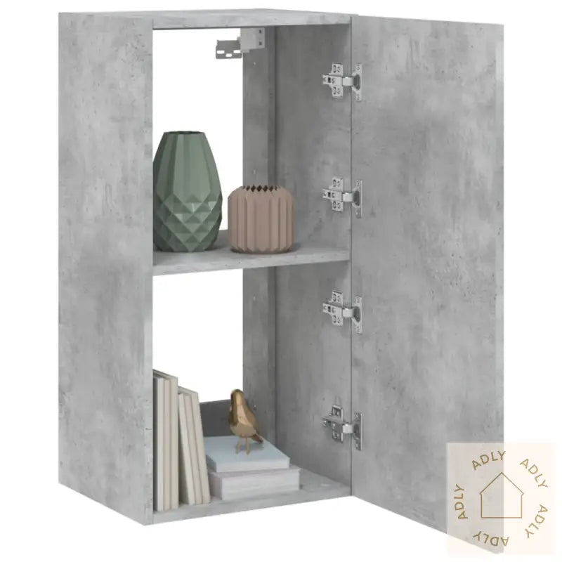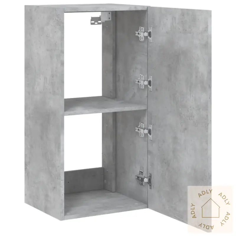 Skruer og plugger for veggmontering følger ikke med. Se etter fester som passer til din veggtype, eller rådfør deg med fagfolk hvis du er usikker. Det er viktig å følge instruksjonene nøye under montering.Produktet har en USB-kontakt som krever en sertifisert 5V USB-strømkilde (ikke inkludert).Farge: betonggråMateriale: konstruert treMål: 40,5 x 35 x 80 cm (B x D x H)Mål rom: 37 x 35 x 37,5 cm (B x D x H)Montering kreves: ja