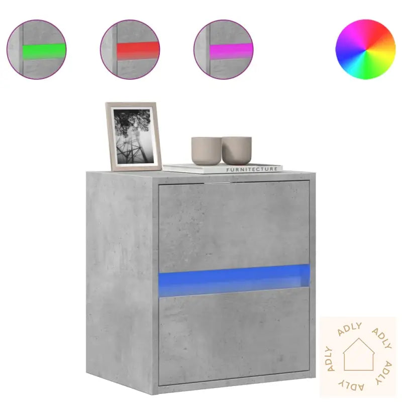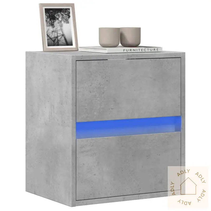 Skruer og plugger for innvendig vegg følger ikke med, så husk å velge festemidler tilpasset akkurat dine vegger. Rådspør en fagperson om du er usikker. Følg monteringsanvisningen nøye for best resultat.USB-kontakten til LED-lysene krever en sertifisert 5V USB-strømkilde (ikke inkludert).Farge: Betonggrå – gir et stilrent og moderne uttrykk som glir godt inn sammen med andre møbler til hjemmet.Materiale: Konstruert tre – robust, stabilt og gir lang levetid.Mål: 41 x 31 x 45 cm (L x B x H) – kompakt format som passer inn i de fleste rom.Antall skuffer: 2 – smarte oppbevaringsmuligheter uten rot.Med LED-lys for justerbar belysning.Montering kreves.