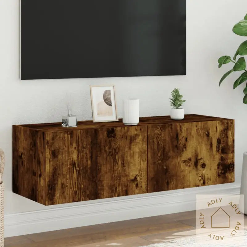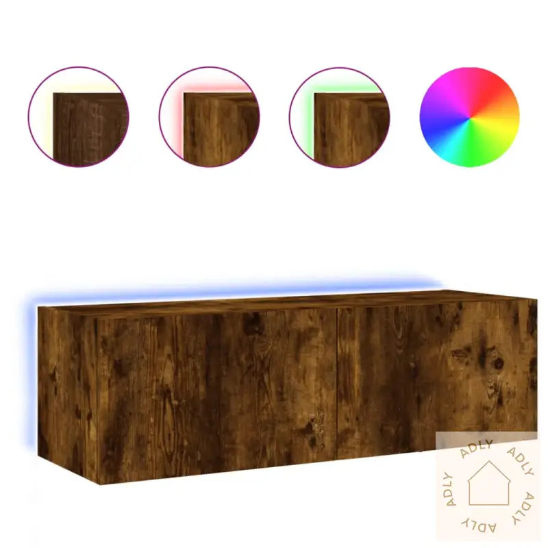 TV-benken er laget av konstruert tre, et slitesterkt materiale av høy kvalitet med en jevn overflate, god styrke og stabilitet. Det har også god motstand mot fuktighet, så du kan regne med at denne benken holder seg fin i lang tid.For å virkelig løfte stilen har TV-skapet RGB LED-lys integrert. Du kan velge mellom forskjellige farger og lyseffekter, og det er mulig å stille inn lysene slik at de justeres automatisk. Dette gir ikke bare den veggmonterte enheten et nytt og spennende utseende, men skaper også en koselig og trendy stemning i rommet – helt perfekt hvis du er ute etter spennende detaljer innen møbler til hjemmet!Inni finner du godt med lagringsplass: to rom bak dørene gjør det enkelt å holde orden på alt av småting. Organiser bøker, DVD-er, magasiner eller annet tilbehør slik at de alltid er lett tilgjengelige uten at det ser rotete ut. Her får du ekstra oppbevaring som matcher moderne bokhyller og stående hyller.Den veggmonterte designen gir deg mer gulvplass og åpner opp rommet. Skapet henger på veggen, noe som gir et luftig uttrykk og gjør støvsugingen mye enklere. Perfekt om du liker å holde det minimalistisk og praktisk.Godt å vite: