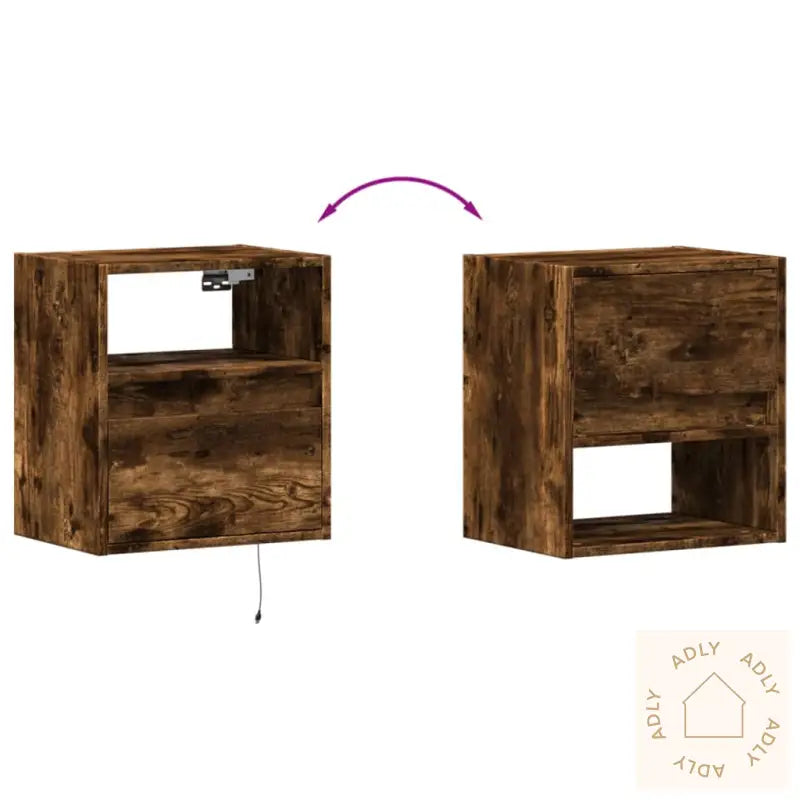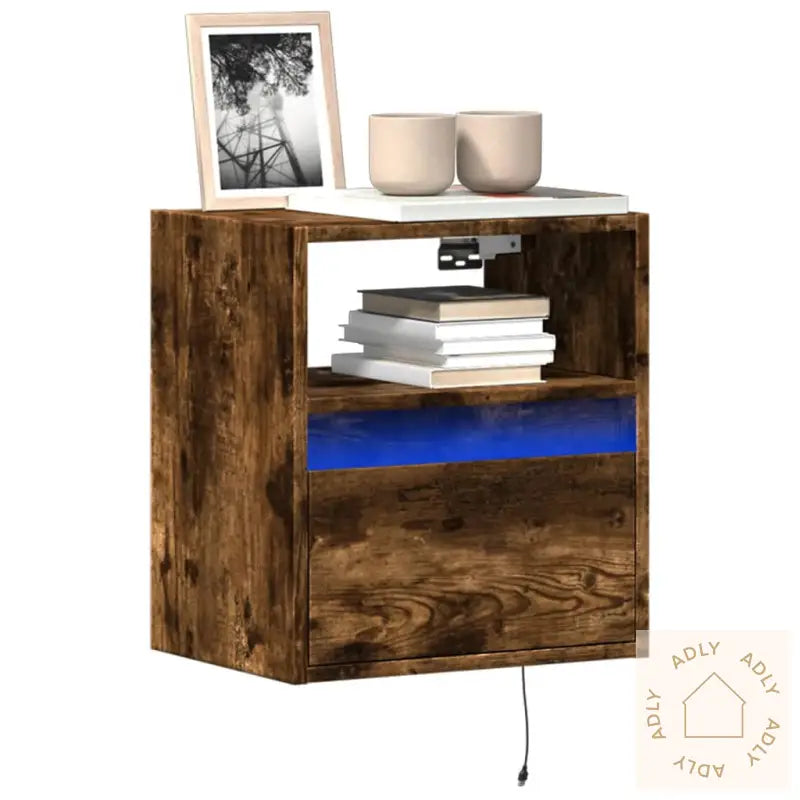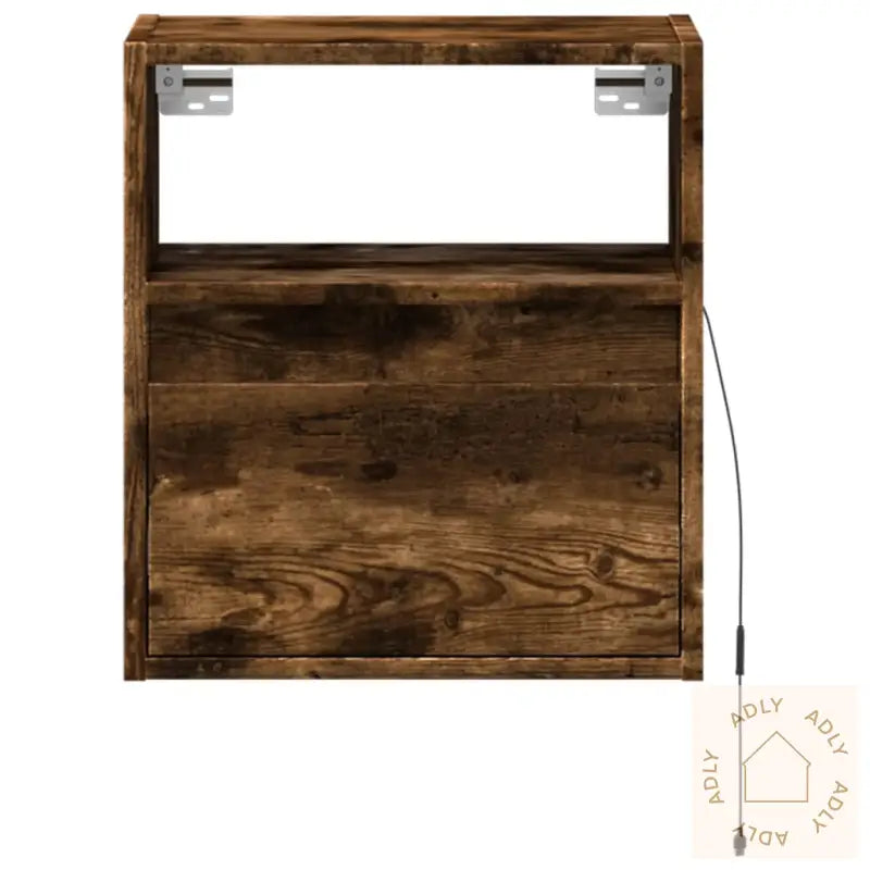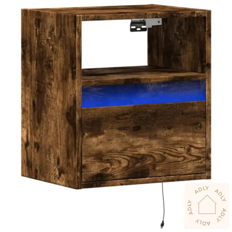 Skruer og plugger til innvendig vegg følger ikke med. For best resultat bør du finne festeutstyr som passer veggen din, og gjerne rådføre deg med fagfolk om du er usikker. Husk å følge monteringsinstruksjonen grundig for både sikkerhet og best mulig sluttresultat.TV-benken leveres med en USB-kontakt og krever en sertifisert 5V USB-strømkilde (denne er ikke inkludert).Farge: røkt eik – passer inn med de fleste andre moderne møbler og hagemøblerMateriale: konstruert tre – praktisk, robust og lett å vedlikeholdeMål: 41 x 31 x 45 cm (L x B x H)Antall skuffer: 1Antall rom: 1Med LED-lysMontering kreves: ja