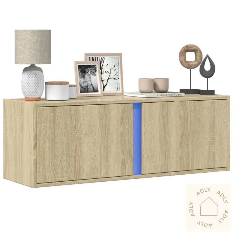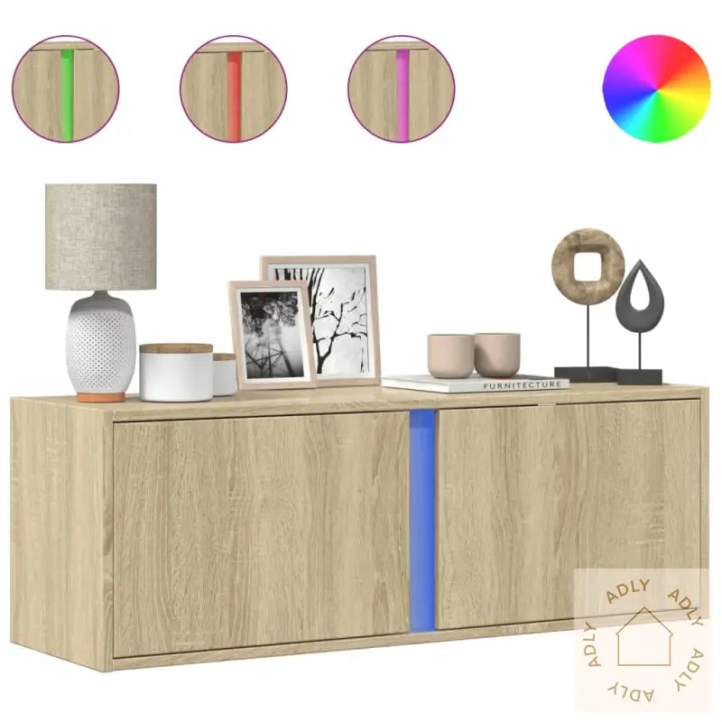 Stabilt og slitesterkt materiale: Denne TV-benken er laget i konstruert tre, kjent for sin jevne overflate og motstandsdyktighet mot fukt, vridning og oppsprekking. Dette solide materialvalget gjør benken robust og holdbar over tid, selv ved daglig bruk, og er derfor et trygt alternativ uansett innredningsbehov.RGB LED-lys for en behagelig atmosfære: Med innebygde LED-lys kan du tilpasse belysningen etter humør eller anledning. Skap stemning med ulike farger, lysstyrker og lyseffekter – perfekt for å gi både TV-stunder og hverdagsstunder et hyggelig og personlig preg.Rikelig med oppbevaringsplass: Den vegghengte designen gir god plass til bøker, magasiner, DVD-er, medieutstyr og annet du vil ha organisert men lett tilgjengelig. Løsningen gjør det enkelt å holde stuen fri for rot samtidig som alt er på sin faste plass.Plassbesparende: Fordi denne TV-benken monteres rett på veggen, får du ekstra gulvplass til andre hagemøbler, dekor eller lek. Det gir rom for mer luft og åpenhet i rommet – spesielt nyttig i mindre leiligheter og rom hvor hver kvadratmeter teller.DIY-design: Det flytende skapet har et moderne uttrykk og kan brukes alene eller matches med andre vegghengte TV-løsninger for å skape ditt eget komplette underholdningssenter. Kombiner flere enheter, eller sett det opp sammen med bokhyller og stående hyller i samme finish for en helhetlig stil i sonoma eik.Godt å vite: