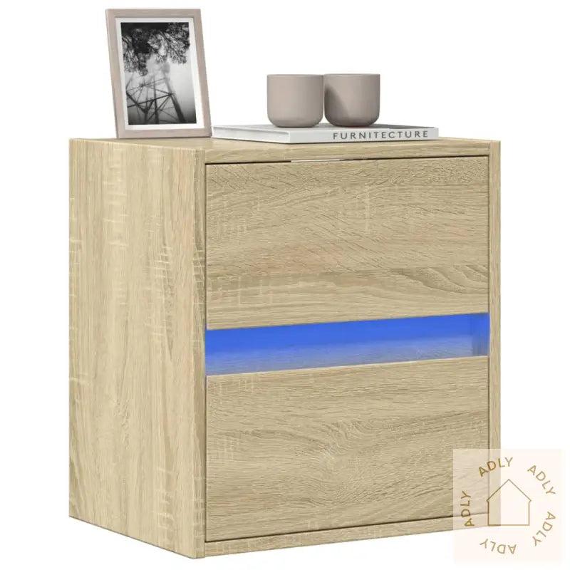 Skruer og plugger til innvendig vegg medfølger ikke, så det er lurt å velge festemidler som passer til akkurat dine vegger – spør gjerne en fagperson hvis du er usikker, og følg alltid monteringsanvisningen nøye.TV-benken har USB-kontakt og trenger en sertifisert 5V USB-strømkilde for LED-lys (strømkilde er ikke inkludert).Farge: sonoma eikMateriale: konstruert treMål: 41 x 31 x 45 cm (L x B x H)Antall skuffer: 2Med LED-lysMontering kreves: ja