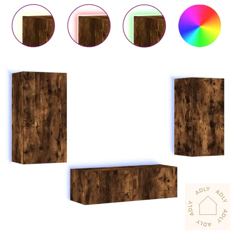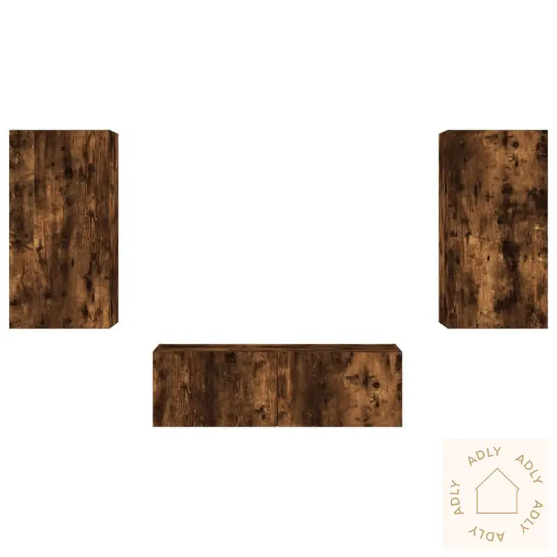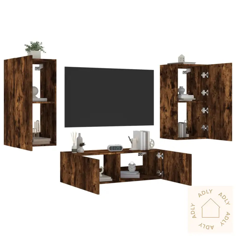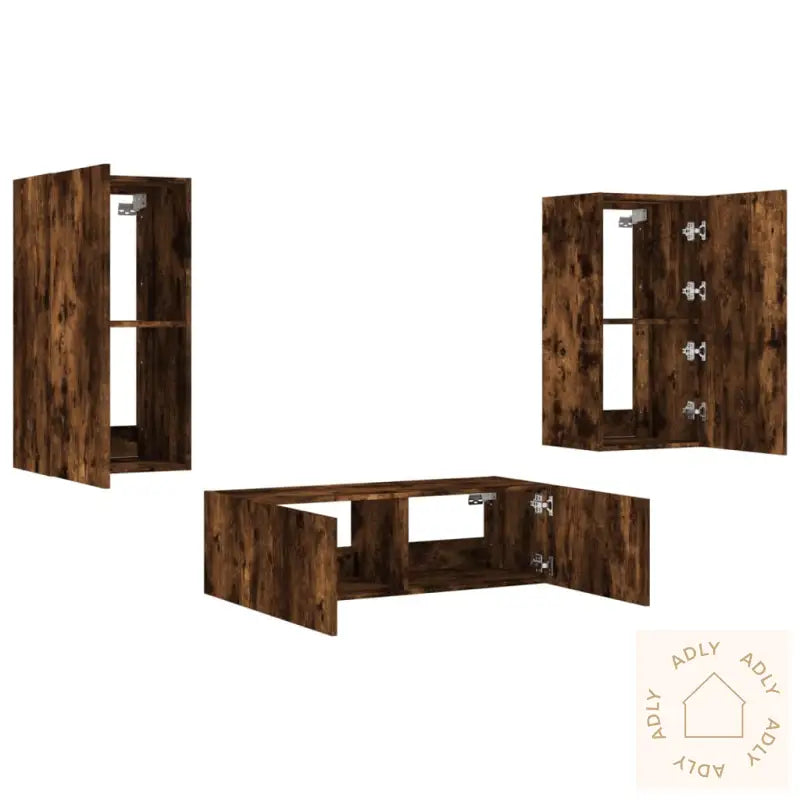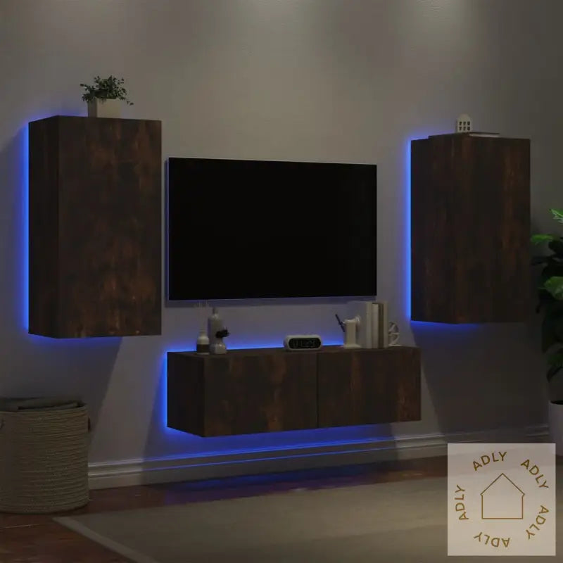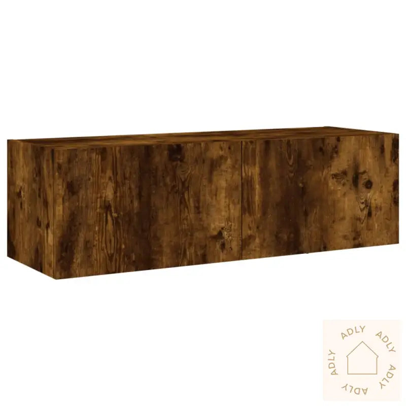 Skruer og plugger til veggmontering følger ikke med. Bruk festemateriell som passer for din veggtype, og spør gjerne en fagperson om råd. Følg alltid instruksjonene nøye.Produktet har USB-kontakt for lysene, så husk å bruke en sertifisert 5V USB-strømkilde (ikke inkludert).Farge: Røkt eikMateriale: Konstruert treMontering krevesLeveransen inneholder:2 x vegghengte TV-benker: 40,5 x 35 x 80 cm (B x D x H)1 x vegghengt TV-benk: 100 x 35 x 31 cm (B x D x H)