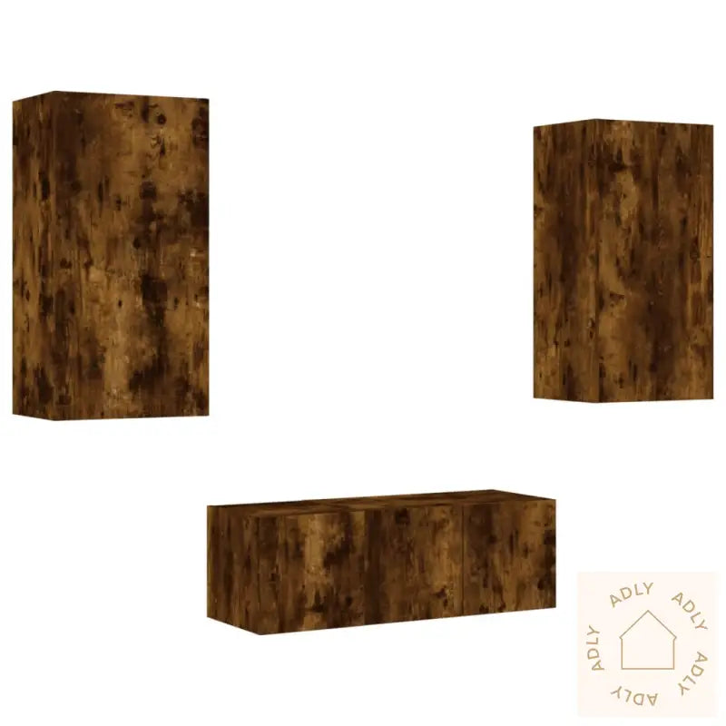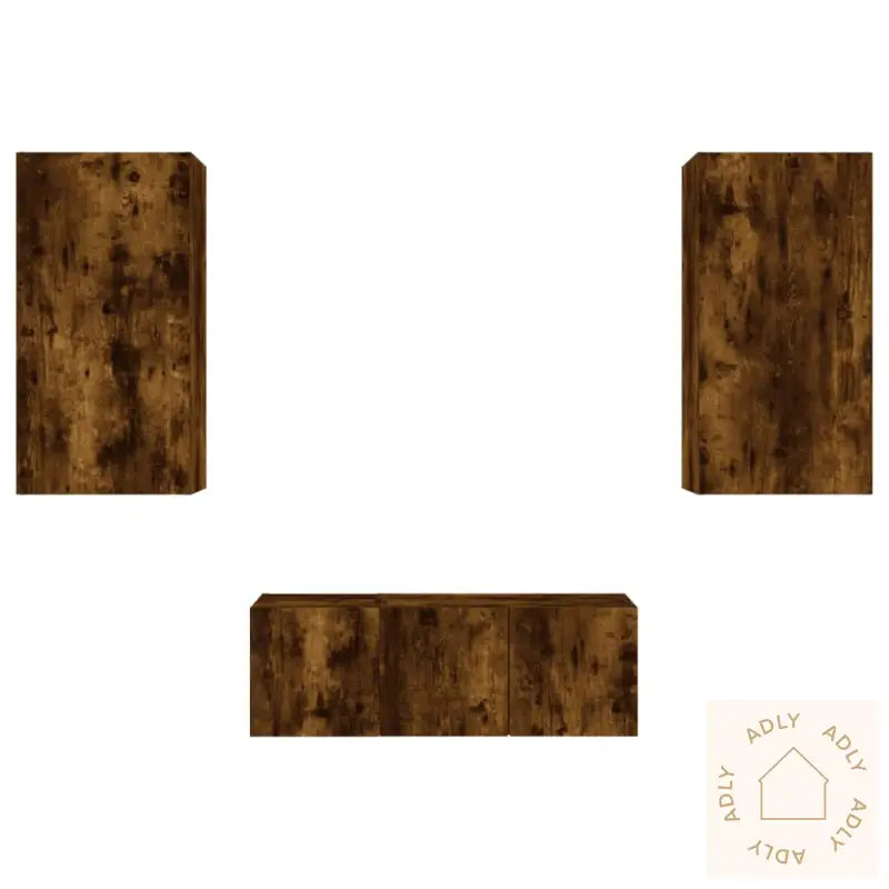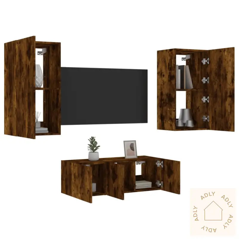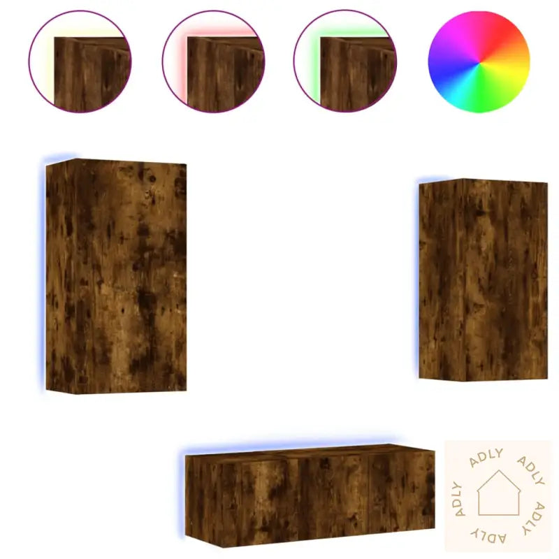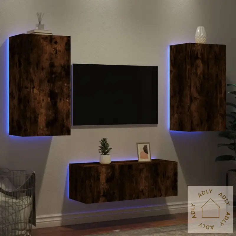 Skruer og plugger til veggmontering følger ikke med. Husk å bruke festemidler som passer til akkurat dine vegger – spør gjerne en fagperson hvis du er usikker. For best resultat bør alle instrukser følges nøye.Produktet har USB-kontakt for RGB LED-lysene, og trenger en sertifisert 5V USB-strømkilde (ikke inkludert).Farge: røkt eikMateriale: konstruert treMontering kreves: jaLeveransen inneholder:1 x vegghengt TV-benk: 30,5 x 35 x 30 cm (L x B x H)2 x vegghengte TV-benker: 40,5 x 35 x 80 cm (L x B x H)1 x vegghengt TV-benk: 60 x 35 x 31 cm (L x B x H)
