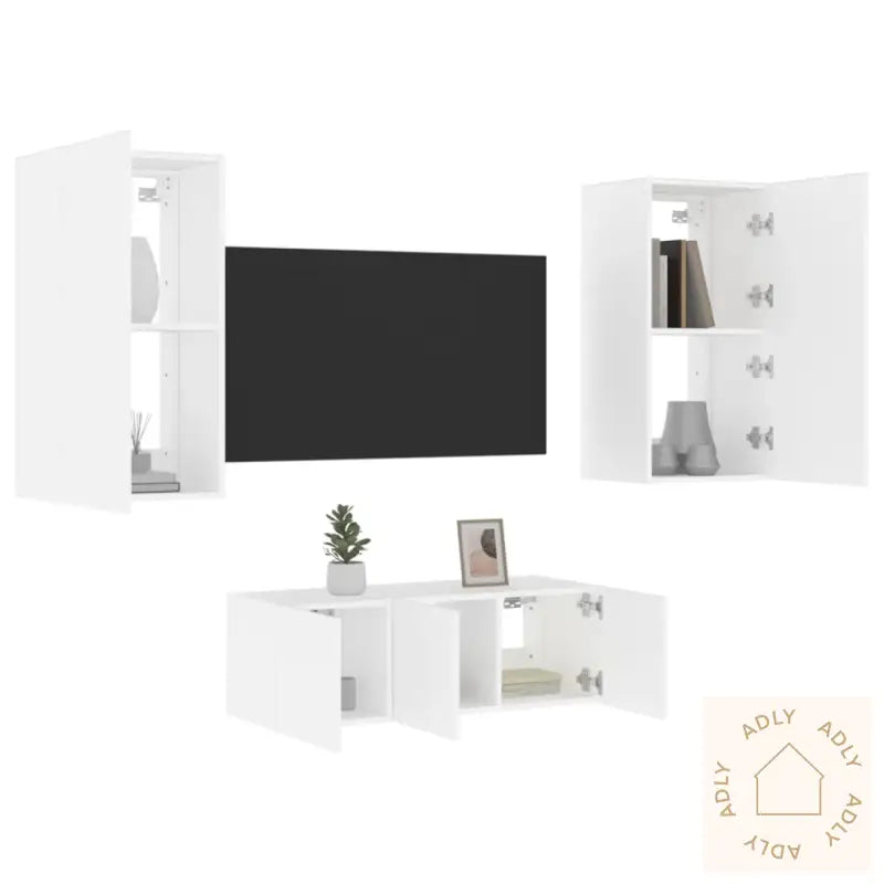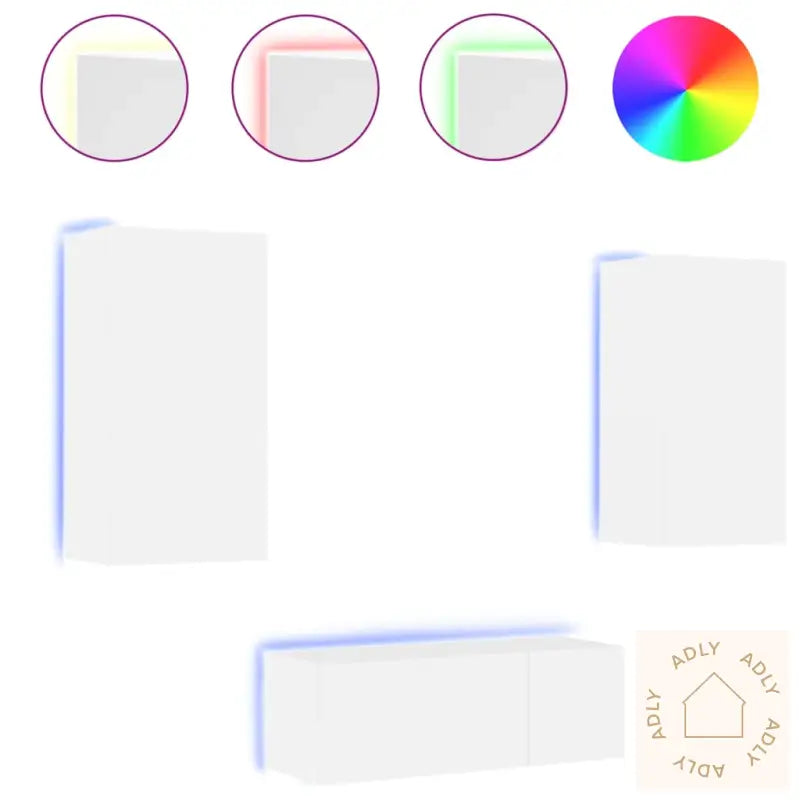 Skruer og plugger til veggmontering følger ikke med. Vi anbefaler at du bruker festeanordninger tilpasset akkurat din veggtype, og tar kontakt med fagperson hvis du er usikker. Husk å følge alle monteringsinstruksjoner nøye.Produktet har USB-kontakt for RGB LED-lys og krever en sertifisert 5V USB-strømkilde (ikke inkludert).Farge: hvitMateriale: konstruert treMontering kreves: jaLeveransen inneholder:1 x vegghengt TV-benk: 30,5 x 35 x 30 cm (L x B x H)2 x vegghengte TV-benker: 40,5 x 35 x 80 cm (L x B x H)1 x vegghengt TV-benk: 60 x 35 x 31 cm (L x B x H)