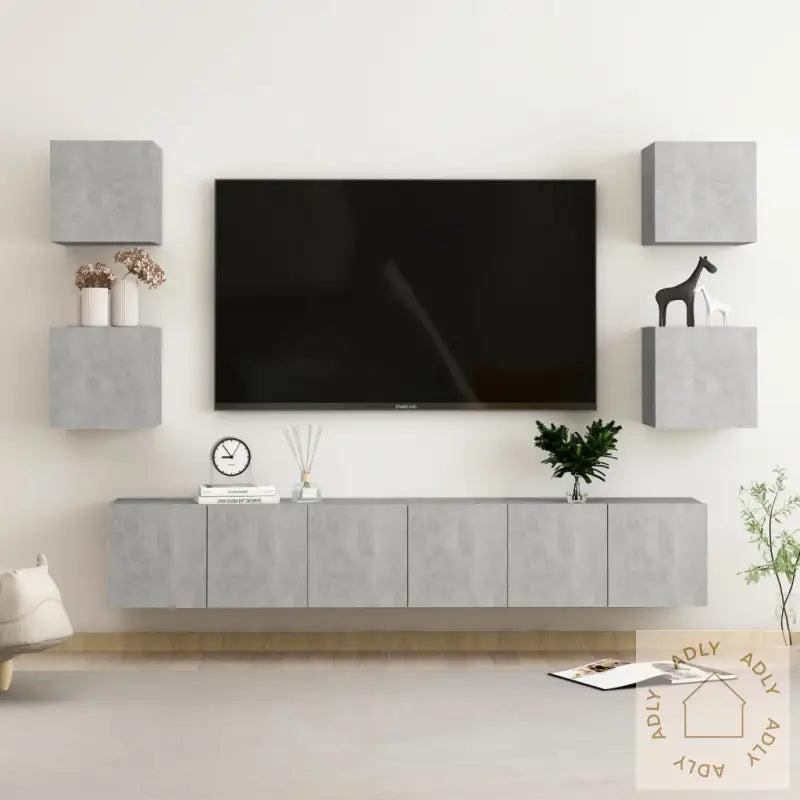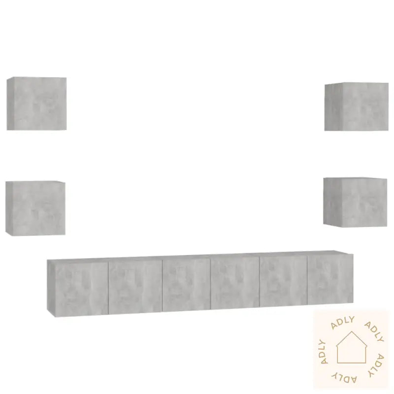 Farge: betonggråMateriale: konstruert treMål (stort): 60 x 30 x 30 cm (B x D x H)Mål (S): 30,5 x 30 x 30 cm (B x D x H)Montering kreves: jaLeveransen inneholder:3 x TV-benk (L)4 x TV-benk (S)