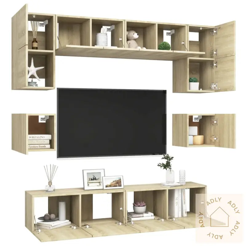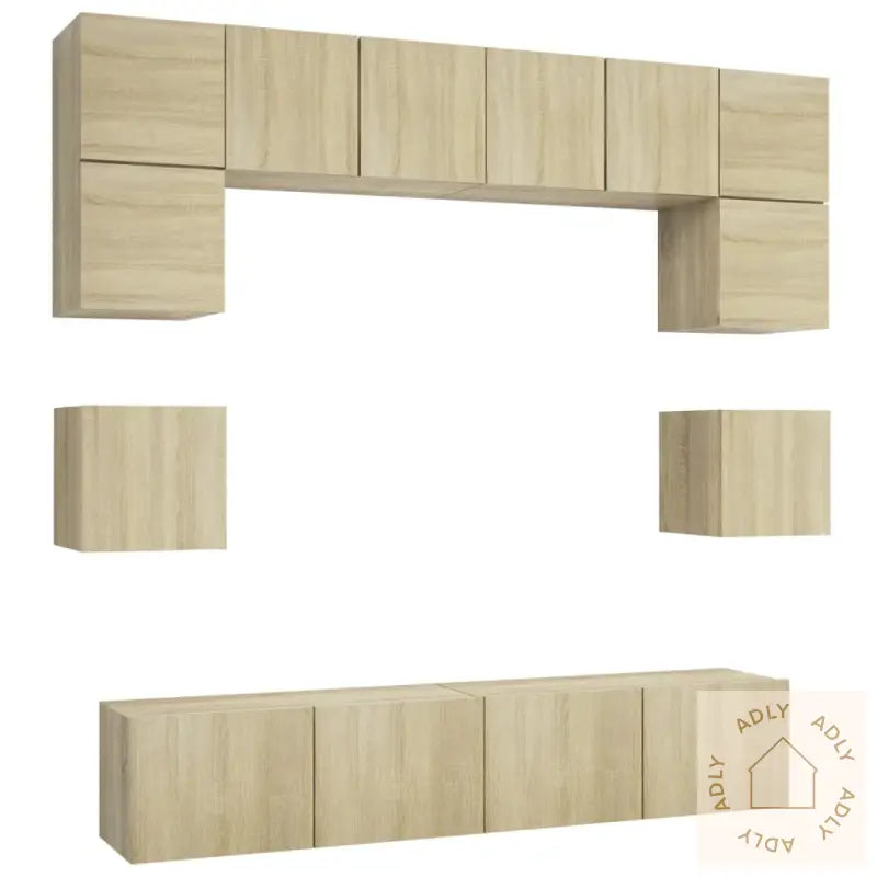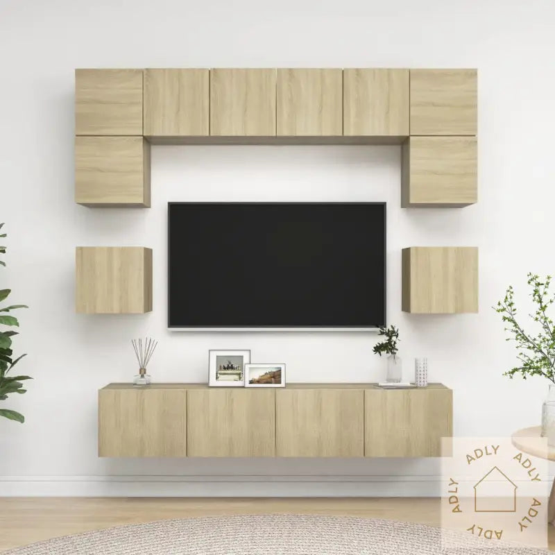 Dette vegghengte TV-benksettet i sonoma eik gir deg masse oppbevaringsplass, så du enkelt kan holde orden på ulike ting som fjernkontroller, spillkonsoller, bøker eller dekor. Designet sørger for at benkene blir et stilig og funksjonelt blikkfang blant dine møbler til hjemmet.