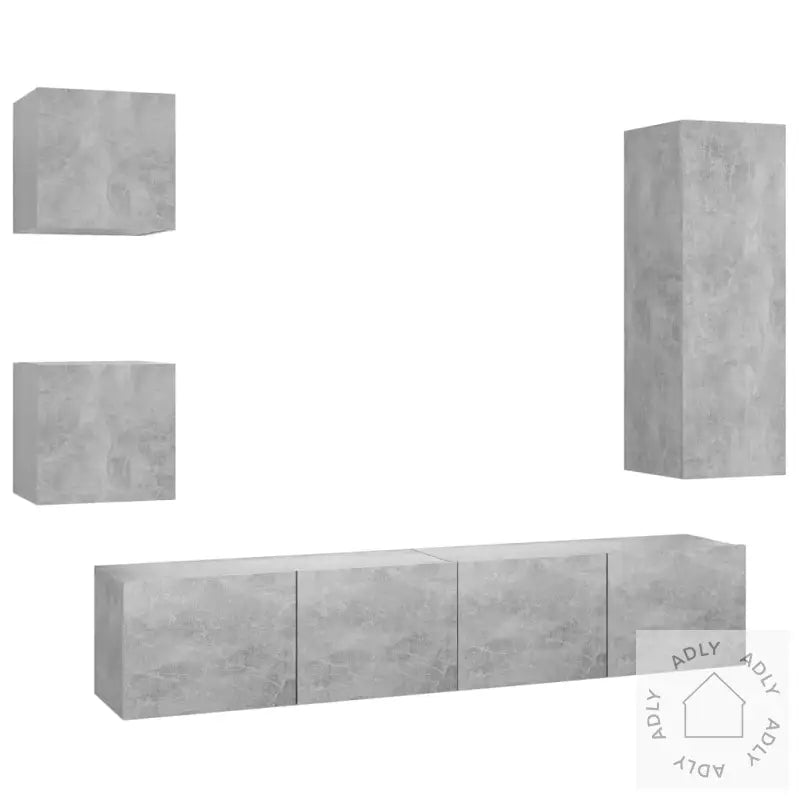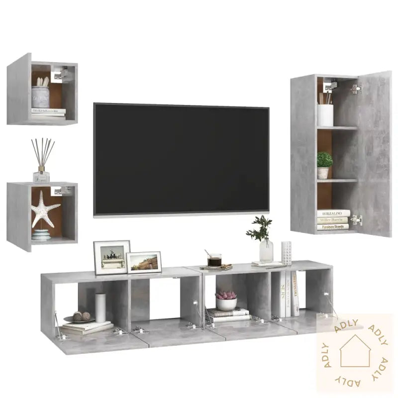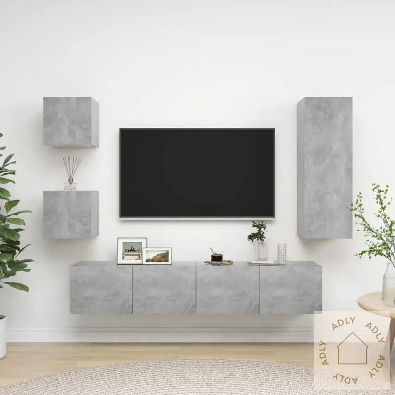 Farge: betonggråMateriale: konstruert treMontering kreves: jaLeveransen inneholder:1 x TV-benk: 30,5 x 30 x 90 cm (B x D x H)2 x TV-skap: 80 x 30 x 30 cm (B x D x H)2 x TV-benker: 30,5 x 30 x 30 cm (B x D x H)