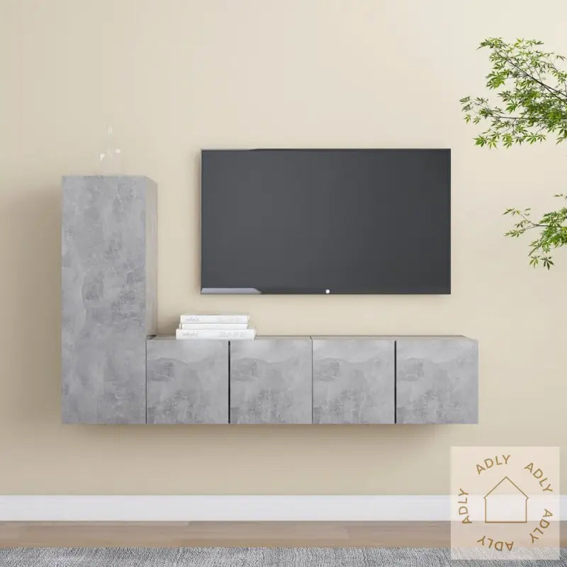 TV-benker som monteres på veggen gir god utnyttelse av gulvplassen, og gir rommet et mer luftig preg. HiFi-skapsettet lar deg vise frem favorittgjenstandene dine, samtidig som det gir enkel tilgang til det du bruker mest. Skapene er enkle å holde rene – bare tørk av med en fuktig klut ved behov. Med sitt betonggrå design og materialer i holdbart konstruert tre kombinerer de funksjonalitet og moderne stil, og matcher perfekt med andre møbler eller utendørsmøbler for et helhetlig uttrykk.