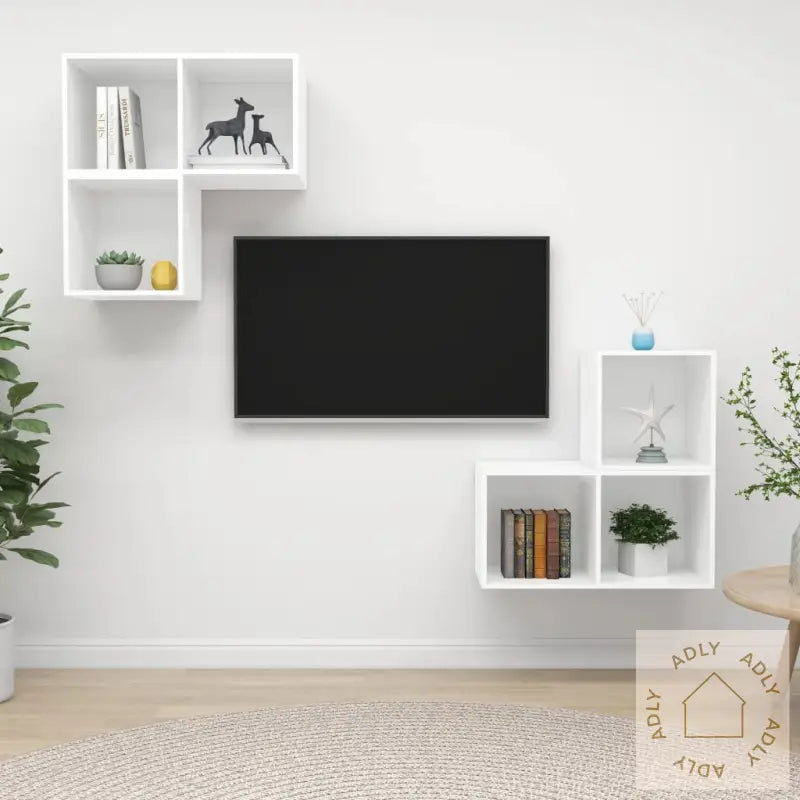 TV-benkene monteres direkte på veggen, noe som gir et ryddig og tidløst uttrykk i stua eller tv-stuen. Dette HiFi-skapsettet gjør det lett å organisere bokhyller og stående hyller, eller vise frem dekorgjenstander og tekniske enheter du vil ha lett tilgjengelige. Skapene er laget av robust, konstruert tre, noe som gir både holdbarhet og en stilren finish, mens den hvite fargen gir en lys og åpen følelse i rommet. I tillegg er overflatene enkle å rengjøre – du tørker bare av med en fuktig klut.