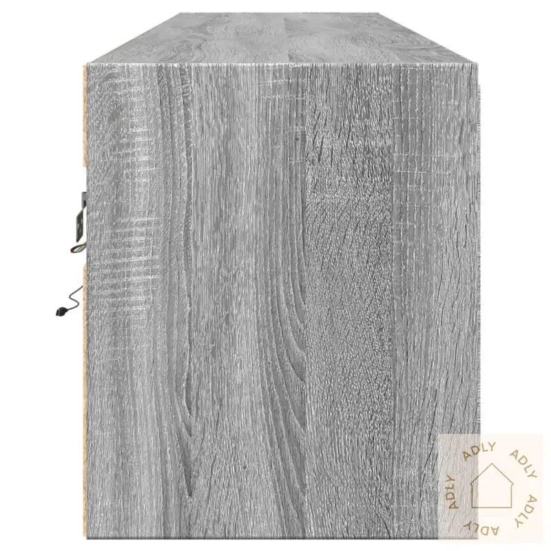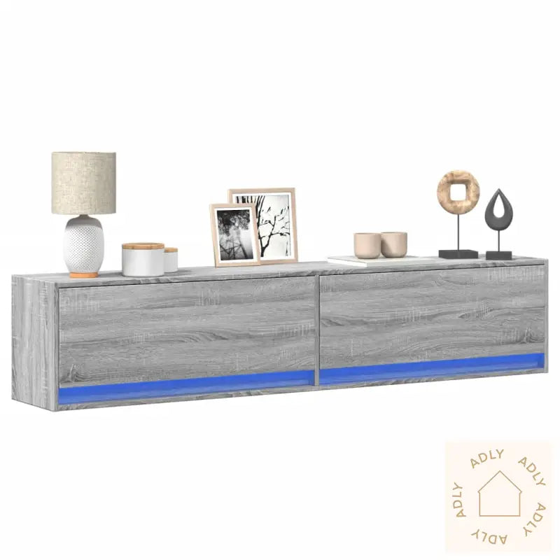 Stabilt og slitesterkt materiale: Benken er laget av konstruert tre, kjent for å være solid, motstandsdyktig mot fuktighet og for å holde seg pen over tid uten å vri seg eller sprekke. Det gir deg et pålitelig møbel som ser bra ut og tåler daglig bruk – et viktig valg om du ønsker lang levetid når du kjøper nye møbler til hjemmet.RGB LED-lys for stemning: Integrerte LED-lys med RGB-funksjon gjør det mulig å sette sitt personlige preg på stua. Velg mellom ulike farger og lysstyrker så du alltid har hyggelig stemning, enten det er filmkveld eller du bare vil skape ro med dempet belysning.God oppbevaringsplass: TV-benken byr på mange praktiske oppbevaringsmuligheter. Her får du plass til alt fra magasiner og bøker til DVDer og multimedieenheter. Alt holder seg lett tilgjengelig og organisert, noe som gir deg en ryddig og innbydende atmosfære i rommet.Veggmontert design: Siden denne benken monteres på veggen, frigjør du verdifull gulvplass og gir rommet et luftig og ordentlig uttrykk. Genialt for mindre leiligheter eller steder der hver kvadratmeter teller!Godt å vite: