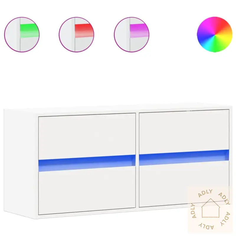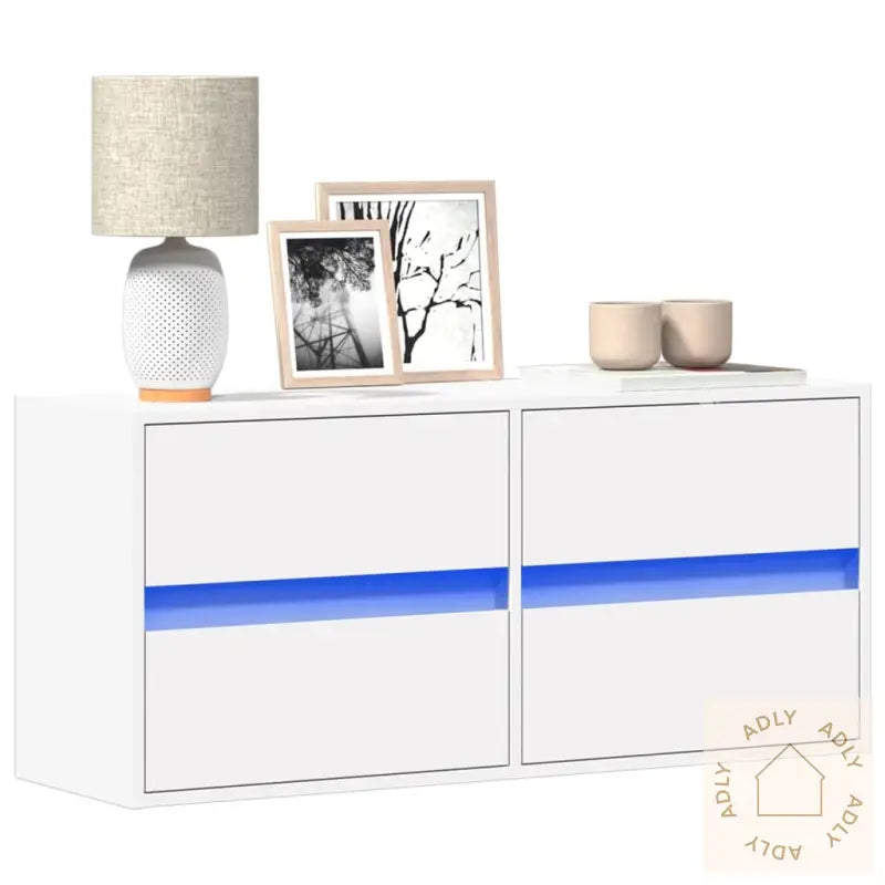 Skruer og plugger til innvendig vegg følger ikke med. Velg skruer og plugger som passer akkurat til din veggtype. Ved usikkerhet, kontakt fagfolk, og følg instruksjonene nøye for sikker montering.TV-benken har USB-kontakt – du trenger derfor en sertifisert 5V USB-strømkilde for LED-lyset (ikke inkludert).Farge: hvitMateriale: konstruert treMål: 100 x 31 x 45 cm (L x B x H)Antall skuffer: 4Med LED-lysMontering kreves: ja