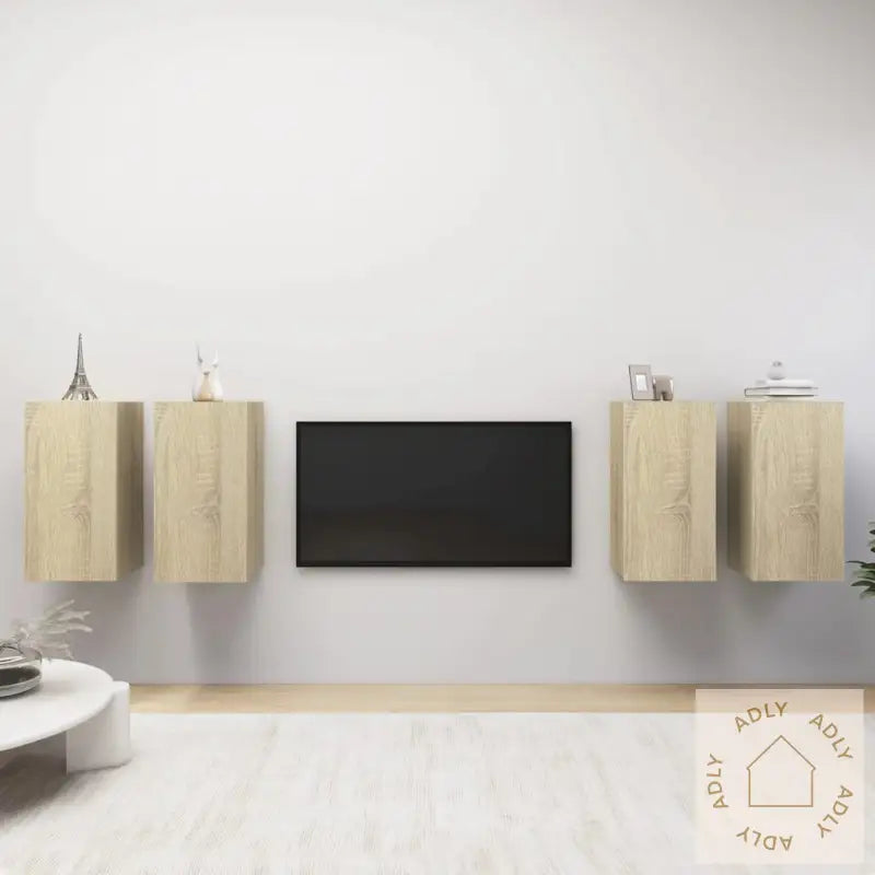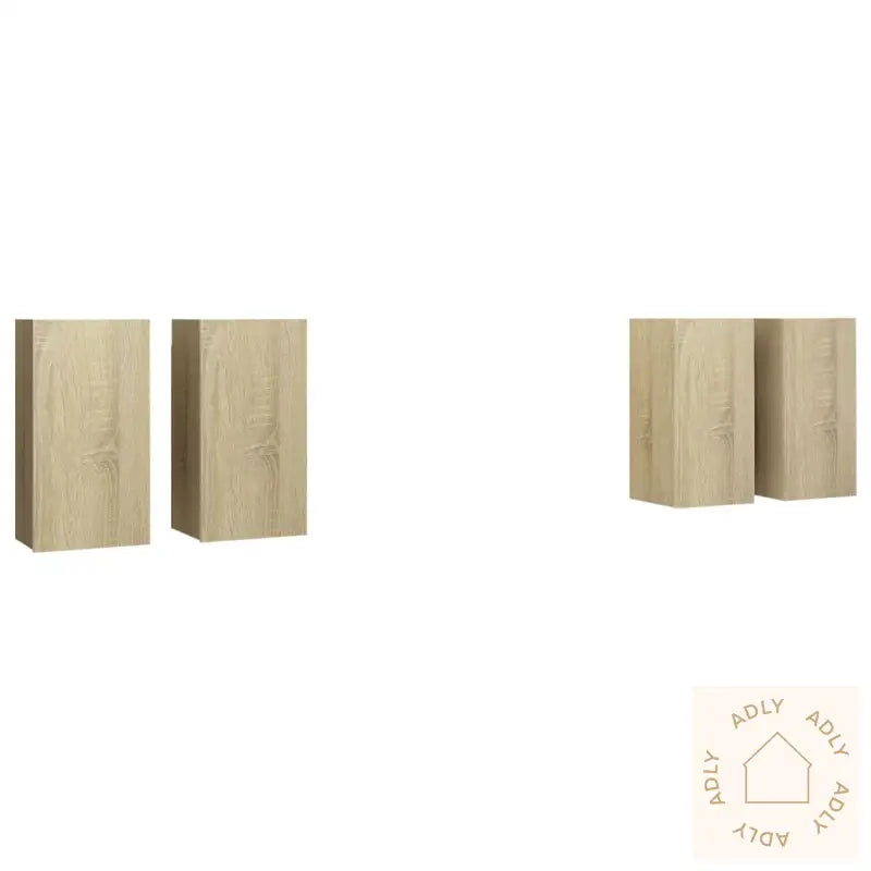De veggmonterte TV-benkene er laget av solid konstruert tre, noe som gir en robust og stabil løsning du kan stole på i lang tid. Hver benk har to hyller – ideelt for organisering og oppbevaring av alt fra bøker og magasiner til DVD-er og andre småting du vil ha lett tilgjengelig. Skapene har et elegant uttrykk inspirert av sonoma eik, som gir en varm og naturlig følelse til rommet. Samtidig er de veldig enkle å holde rene, bare bruk en fuktig klut når du vil fjerne støv eller flekker.