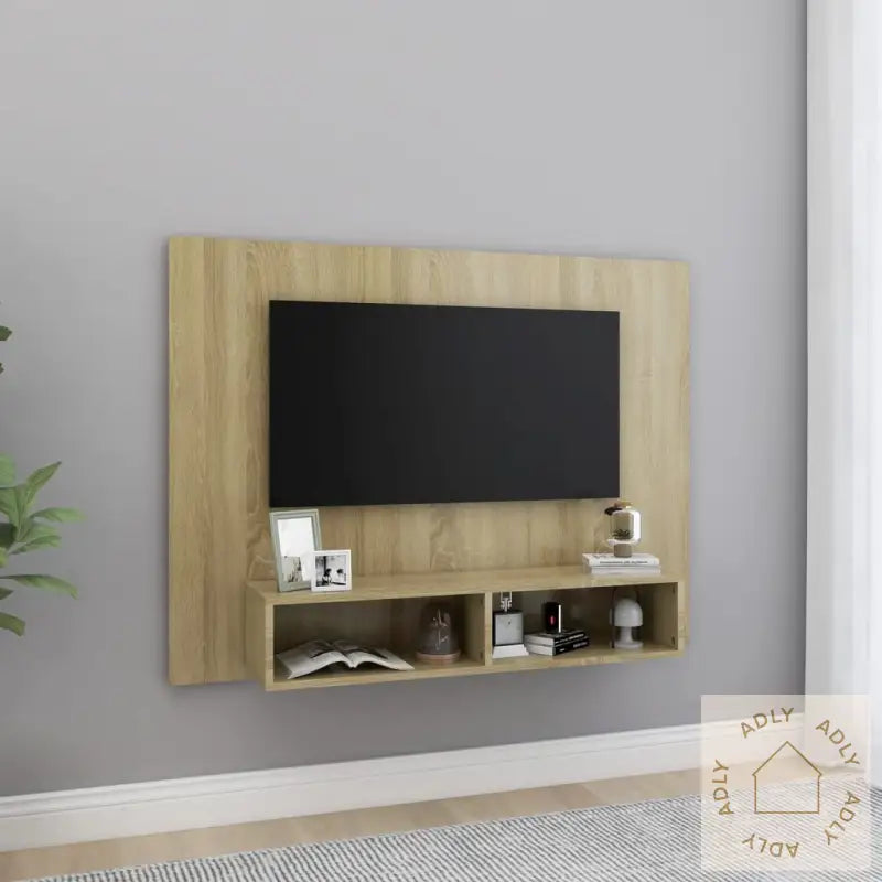 Gi interiøret ditt et snev av eleganse og komfort med denne moderne, veggmonterte TV-benken i tre. Med sin stilrene sonoma eik-finish løfter denne TV-benken hele rommet og passer perfekt inn sammen med andre møbler til hjemmet.