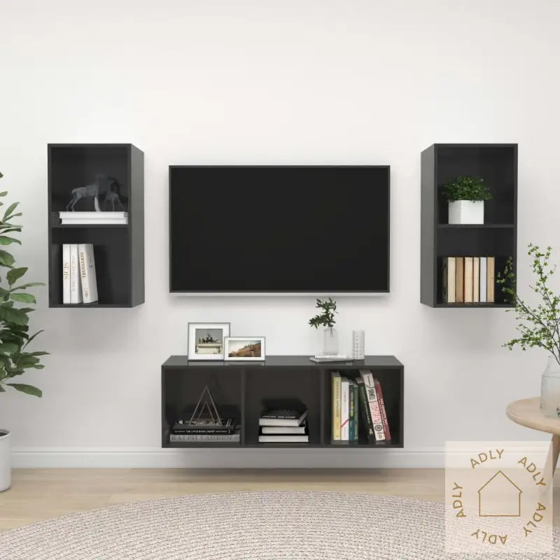 TV-benkene monteres direkte på veggen, noe som gir rommet et rent og tidløst uttrykk. Dette HiFi-skapsettet passer perfekt til å vise frem dekorasjoner eller holde bokhyller og stående hyller ryddige og lett tilgjengelige. Med den glatte overflaten i høyglans grått er det enkelt å tørke av med en fuktig klut, så vedlikeholdet går som en lek.