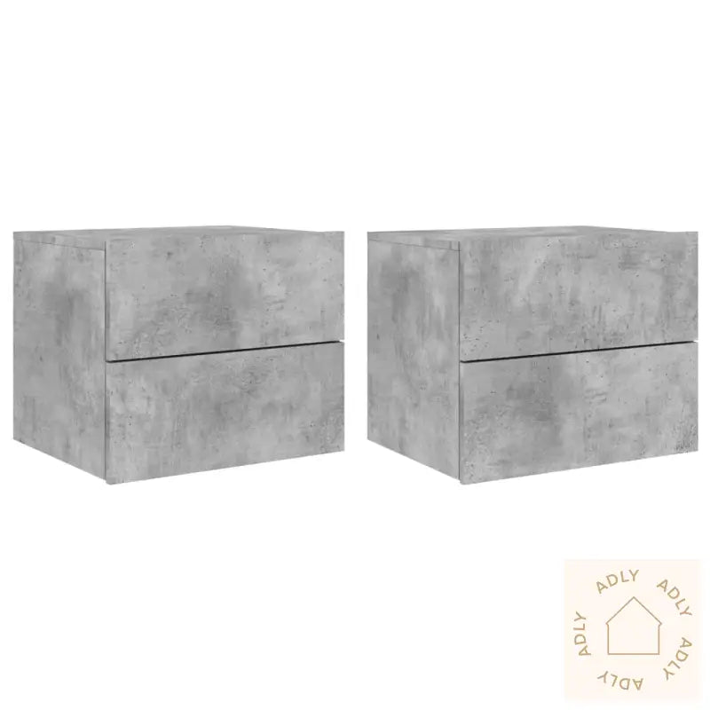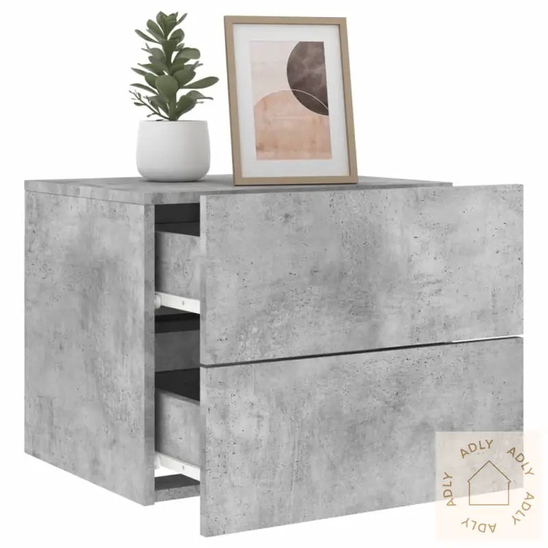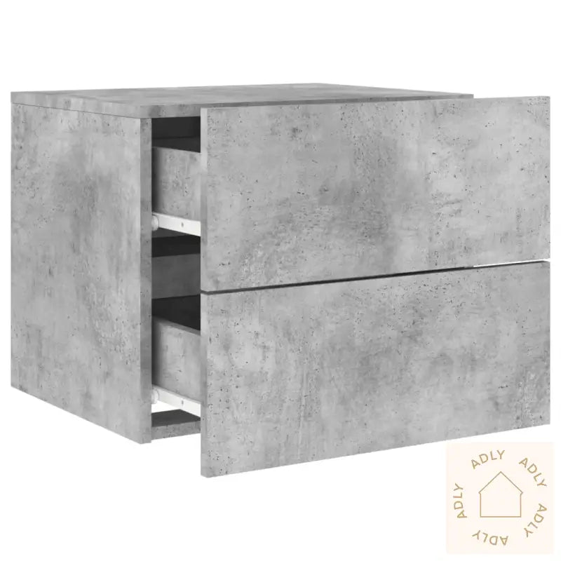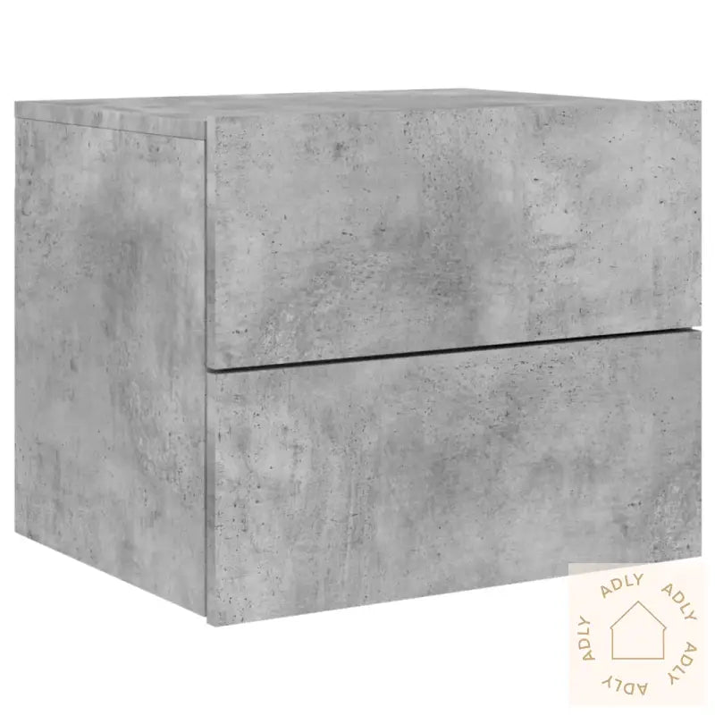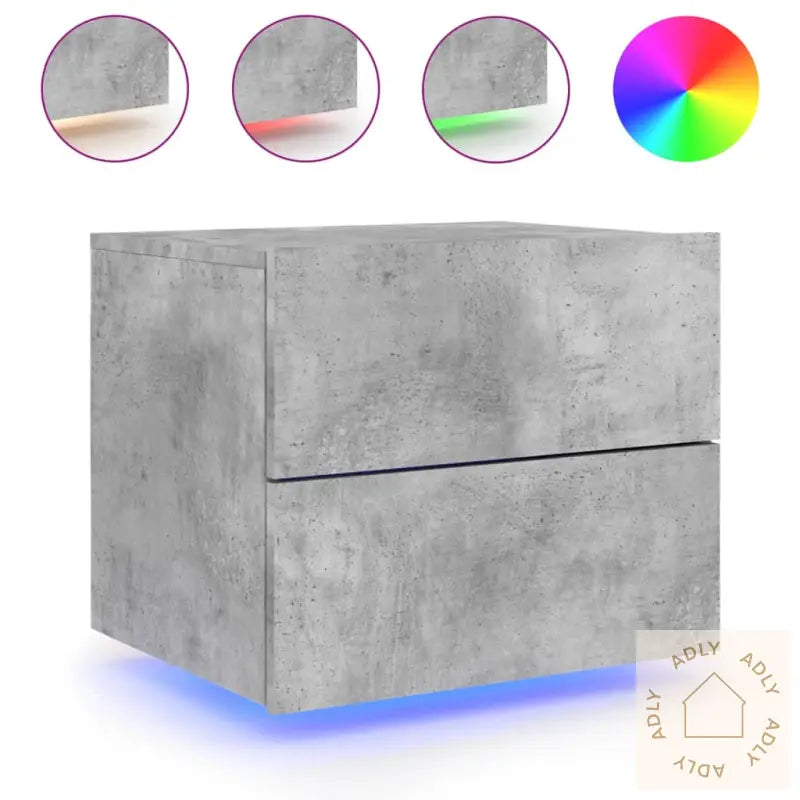 Festemidler (skruer og plugger) for veggmontering følger ikke med. Husk å finne riktige festemidler som passer for din type vegg. Er du usikker, ta kontakt med en fagperson. Husk også å følge monteringsveiledningen nøye for best resultat.RGB LED-lysene har USB-kontakt, så du trenger en passende 5V USB-strømkilde tilkoblet (ikke inkludert).Farge: betonggråMateriale: konstruert treMål: 50 x 39 x 41 cm (B x D x H)Montering kreves: jaLeveransen inneholder:2 x nattbord