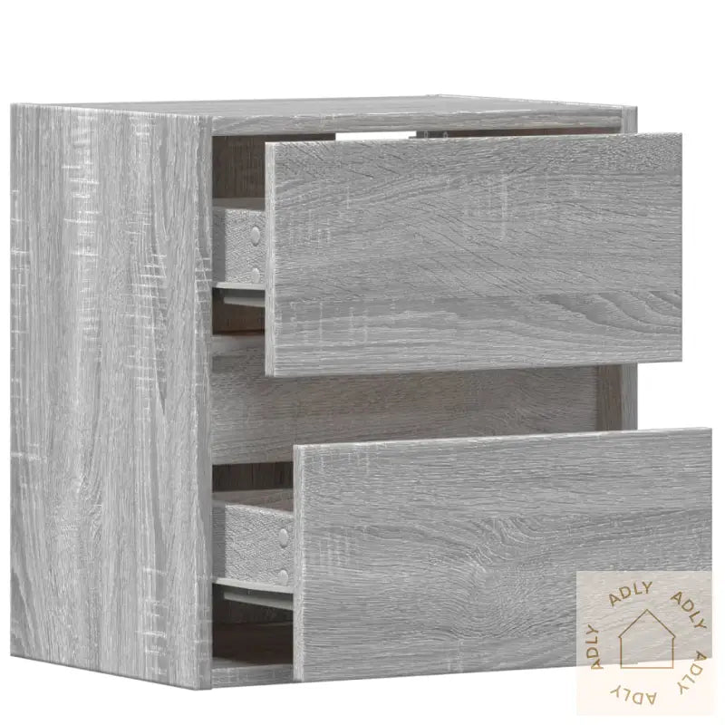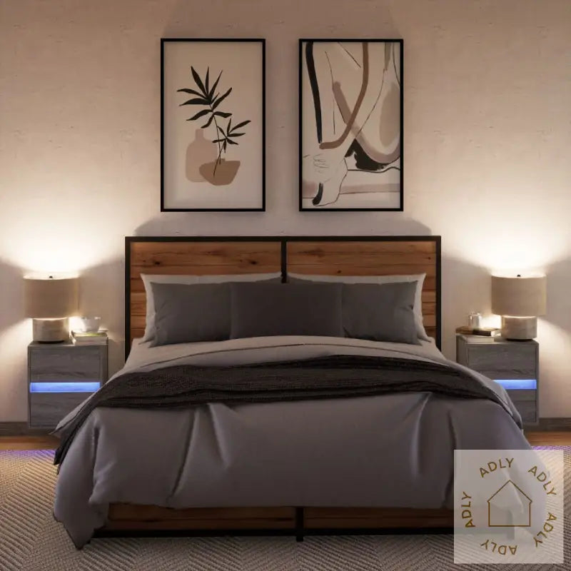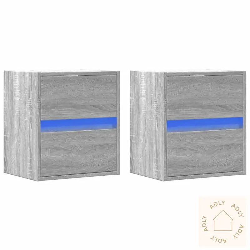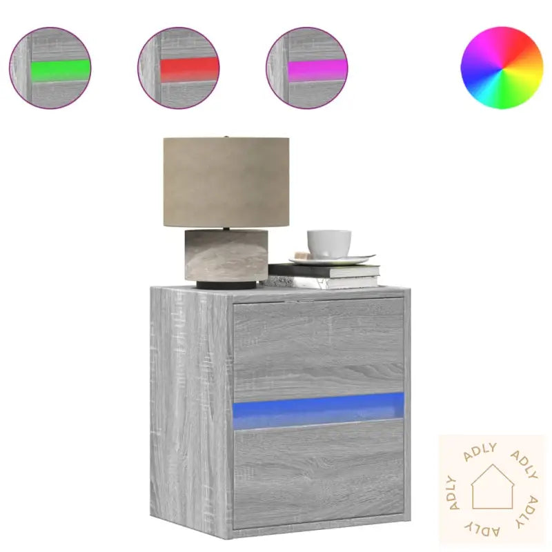 Skruer og plugger for innvendige vegger følger ikke med. Velg alltid riktige festemidler til din veggtype – spør gjerne en fagperson hvis du er i tvil, og følg instruksjonene nøye.Nattbordene har USB-kontakt for LED-lysene, som krever en egen 5V USB-strømkilde (ikke inkludert).Farge: grå sonomaMateriale: konstruert treMål (hver): 41 x 31 x 45 cm (L x B x H)Antall skuffer: 2Med LED-lysMontering kreves: jaLeveransen inneholder:2 x vegghengte nattbord