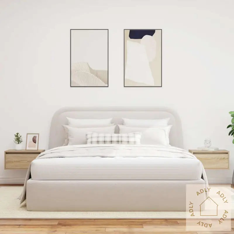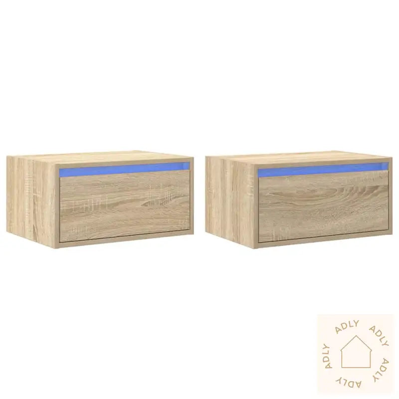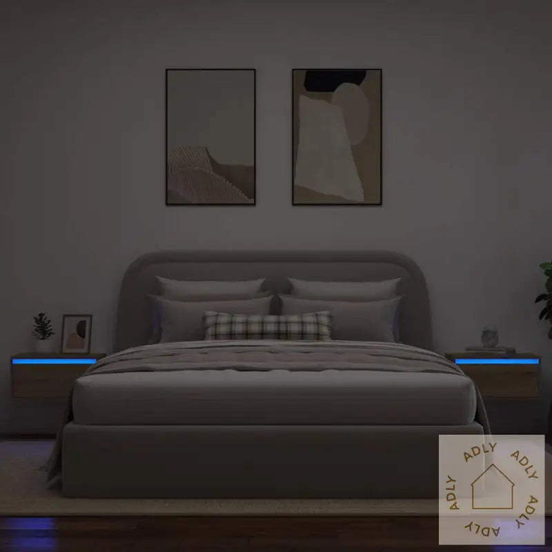 Stabilt og slitesterkt materiale: Nattbordene er laget av konstruert tre – et robust, holdbart materiale som har en jevn overflate og motstår både fuktighet, vridning og sprekker. Dette gjør dem ekstra solide, uansett om de skal brukes i stua, soverommet eller sammen med andre hagemøbler innendørs.Rikelig lagringsplass: Du får rikelig med plass til magasiner, bøker, briller og annet nødvendig tilbehør du vil ha lett tilgjengelig ved sengen. Alt holder seg ryddig og organisert på en elegant måte.RGB LED-lys for personlig atmosfære: De innebygde LED-lysene kan tilpasses etter humør og stil. Velg blant ulike farger, modus og juster lysstyrken for å sette den perfekte stemningen i rommet, enten det er hyggelesing eller avslapping.Plassbesparende, veggmontert design: Det flytende nattbordet festes direkte på veggen, så du frigjør gulvplass og får en mer åpen og modern følelse på rommet. Praktisk for små soverom, eller der du ønsker å utnytte plassen maksimalt.Allsidig topplate: Den solide toppflaten tåler alt fra bordlamper til klokker, bilderammer og små planter. Perfekt når du vil has det du trenger – eller bare pynte opp med dekorasjoner og annet nødvendig utstyr.Godt å vite: