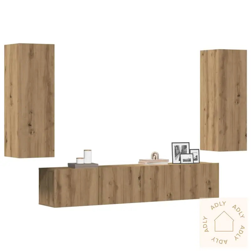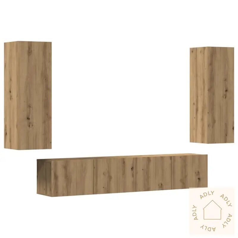 Stabilt og slitesterkt materiale: Skapene er laget av konstruert tre, kjent for å tåle mye bruk og holde seg fine lenge. Materialet har en glatt overflate som sikrer at skapene er både fuktresistente og motstandsdyktige mot vridning og sprekker – perfekt for deg som ønsker varighet og kvalitet.Rikelig med lagringsplass: Med disse skapene får du god plass til å organisere alt av TV-utstyr, fjernkontroller, kabler eller andre nødvendigheter. Praktisk lagring gjør det enkelt å holde stilen ryddig og alt lett tilgjengelig.Praktisk montering: Døren kan monteres på enten høyre eller venstre side, slik at du kan tilpasse skapet etter romløsningen hos deg. Dette bidrar til fleksibilitet under montering og bruk.Moderne stil: Med sitt minimalistiske uttrykk, rette linjer og den varme fargetonen artisan eik, passer skapene perfekt inn i ethvert moderne hjem. De løfter interiøret og gir en tidløs og oppdatert følelse.Godt å vite: