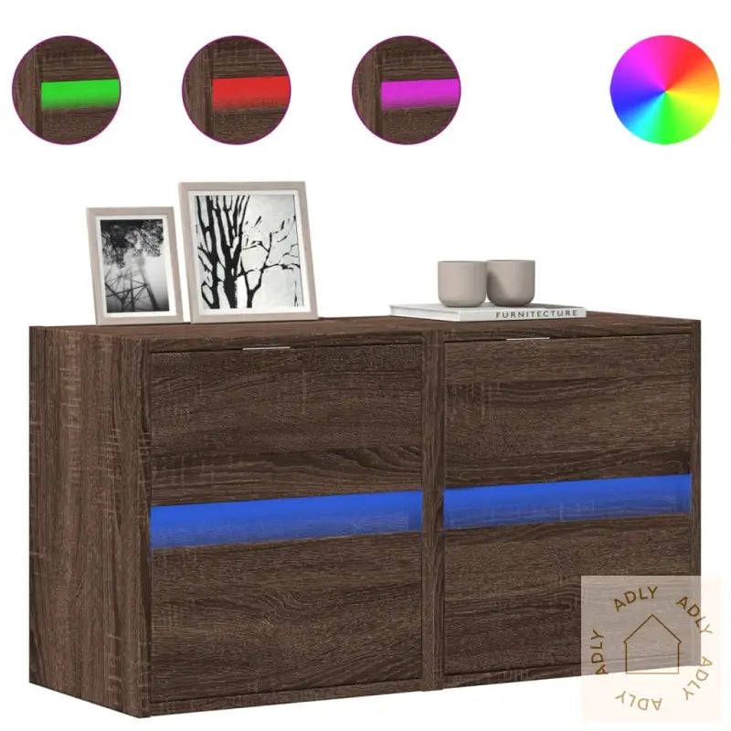 Stabilt og slitesterkt materiale: Konstruert tre gjør denne TV-benken ekstra robust og stabil, med en jevn overflate som motstår både fuktighet, vridning og sprekker. Dette slitesterke materialet er et smart valg for møbler til hjemmet, og passer perfekt sammen med andre møbler som bokhyller og stående hyller i brun eik.RGB LED-lys for en hyggelig atmosfære: Du kan enkelt justere de integrerte LED-lysene med ulike farger, moduser og lysstyrke for å skape din personlige stemning i stua. Kombiner gjerne med annet interiør for å fremheve tv-området og gjøre det ekstra trivelig.Rikelig med oppbevaringsplass: Med 2 praktiske skuffer har du god plass til alt fra bøker, DVDer og magasiner til småting du ønsker å ha lett tilgjengelig. Oppbevaring blir enkelt, ryddig og gir deg oversikt, noe som alltid er et pluss om du ønsker et organisert hjem.Plassbesparende: Det veggmonterte designet gjør at du utnytter veggplassen maksimalt, og får frigjort gulvareal til andre møbler eller hagemøbler, samtidig som rommet føles luftig og moderne.DIY-design: Det flytende TV-skapet gir deg stor frihet til å tilpasse innredningen. Bruk det alene eller kombiner flere vegghengte møbler for å lage ditt eget unike underholdningssenter som matcher resten av stilen med brun eik, bokhyller og andre oppbevaringsløsninger.Godt å vite: