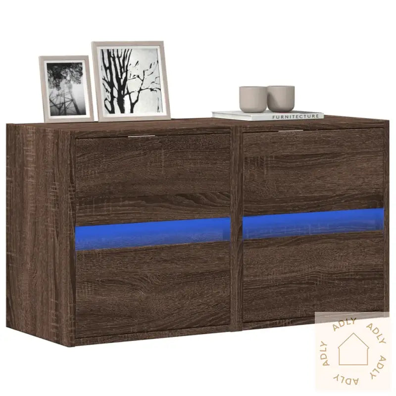 Skruer og plugger for din innvendige vegg følger ikke med. For best resultat anbefales det å finne beslag og plugs som er tilpasset akkurat dine veggtyper. Usikker på hvordan? Kontakt gjerne en profesjonell og følg instruksjonene nøye under montering.TV-benken kommer med USB-kontakt og trenger en sertifisert 5V USB-strømkilde (ikke inkludert) for LED-lysene.Farge: brun eikMateriale: konstruert treMål: 41 x 31 x 45 cm (L x B x H)Antall skuffer: 2Med LED-lysMontering kreves: jaLeveransen inneholder:2 x veggmonterte TV-benker
