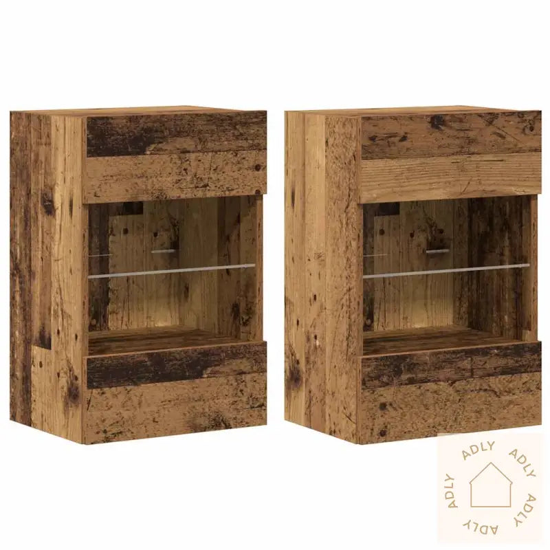 Skruer og plugger til montering på vegg følger ikke med. Du bør finne passende festemateriale til dine veggtyper. Er du usikker, kan det lønne seg å rådføre seg med fagperson og alltid følge monteringsinstruksjonene nøye.Produktet har en USB-kontakt og trenger en ekstern, sertifisert 5V USB-strømkilde for at rgb led-lys skal kunne brukes (strømkilde ikke inkludert).Farge: gammelt treMateriale: konstruert treMål: 40 x 30 x 60,5 cm (B x D x H)Mål rom: 37 x 28,5 x 14 cm (B x D x H)Med glasshylleMontering kreves: jaLeveransen inneholder:2 x veggmonterte TV-benker