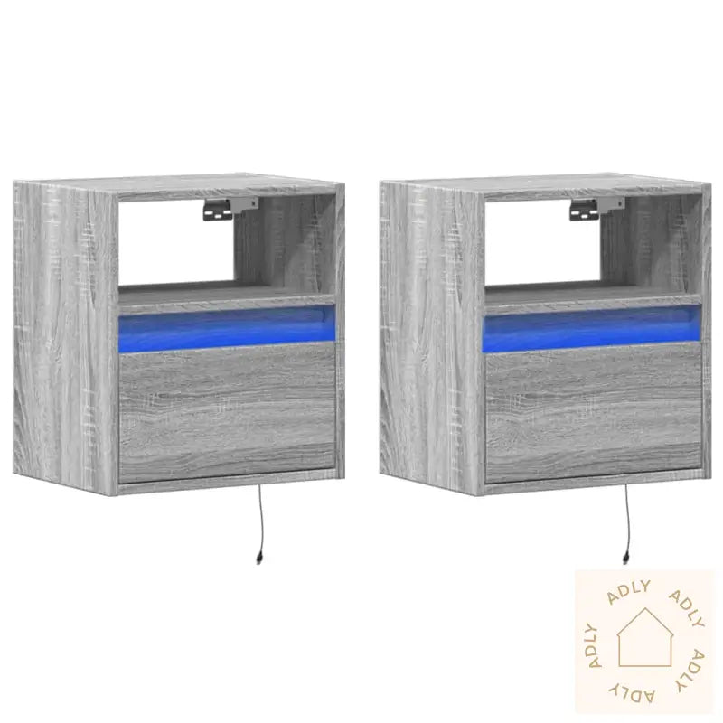 Skruer og plugger til innvendig vegg følger ikke med. Vi anbefaler at du bruker festeutstyr som passer akkurat for dine vegger, gjerne i samråd med en fagperson. Husk å følge monteringsanvisningen nøye.Produktet har USB-kontakt og krever et godkjent 5V USB-strømadapter (ikke inkludert) for å bruke LED-lysene.Farge: grå sonomaMateriale: konstruert treMål: 41 x 31 x 45 cm (L x B x H)Antall skuffer: 1Antall rom: 1Med LED-lysMontering kreves: jaLeveransen inneholder:2 x veggmonterte TV-benker