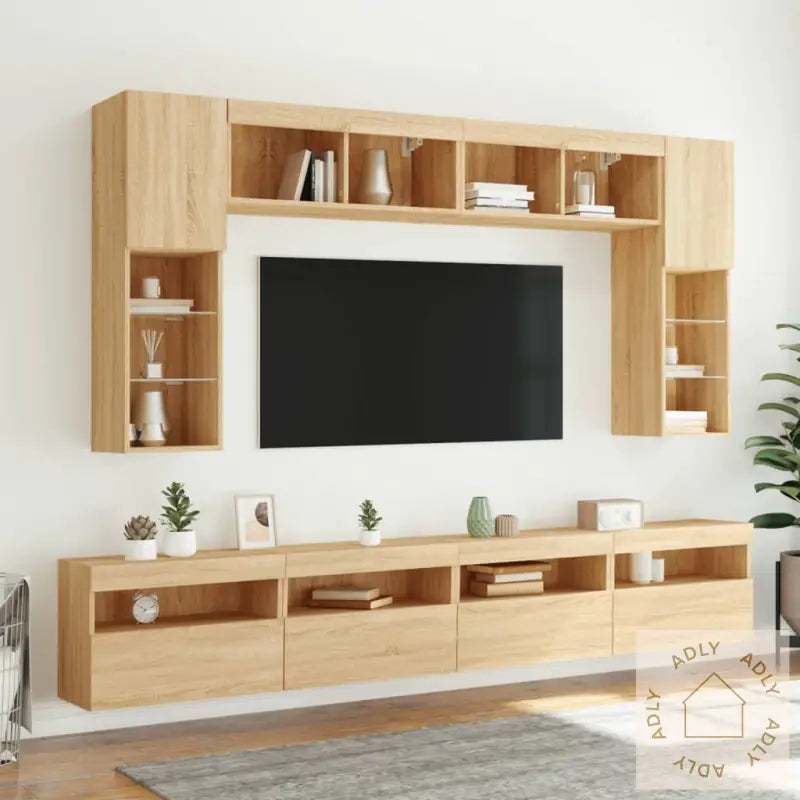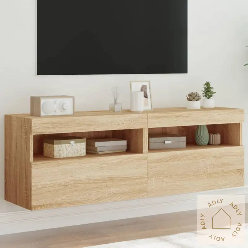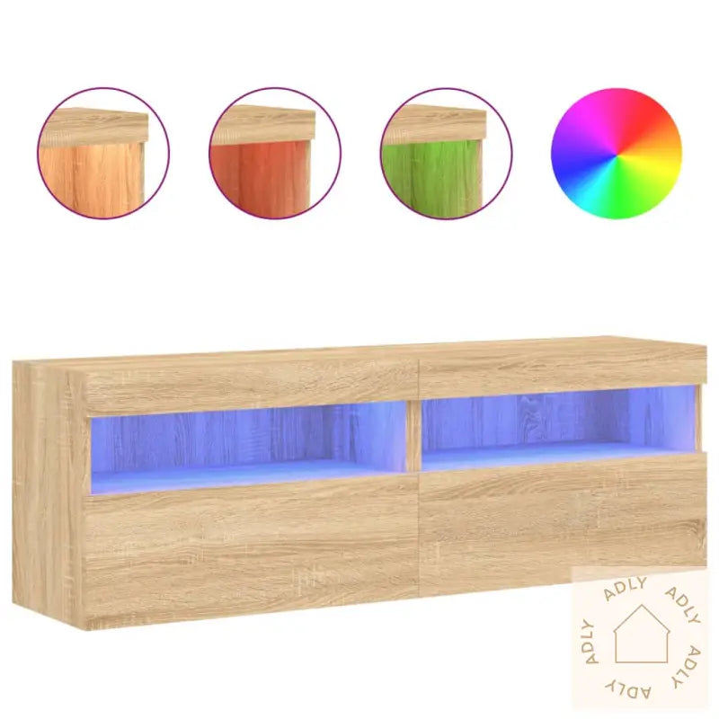 Slitesterkt materiale: Benkene er laget av konstruert tre, kjent for sin eksepsjonelle kvalitet, jevne overflate og flotte finish. Dette materialet gir både styrke, stabilitet og god fuktmotstand, noe som betyr at møbelet holder seg pent lenge – selv ved daglig bruk.RGB LED-lys: Skapene har innebygde RGB LED-lys, som gir deg friheten til å skape akkurat den stemningen du ønsker i stua eller soverommet. Med flere forskjellige lysfarger og justerbare innstillinger kan du enkelt bytte mellom rolige og energiske uttrykk. Dette gir skapet en ekstra trendy detalj og gjør det til et blikkfang blant andre møbler til hjemmet.Rikelig med lagringsplass: God plass inni skapene gjør det enkelt å organisere småting som bøker, DVD-er, fjernkontroller eller magasiner. Alt har sin faste plass, noe som gir både orden og oversikt samtidig som stilen på rommet opprettholdes.Allsidig: Disse veggskapene er ikke bare TV-benker, men kan også brukes som nattbord eller kombineres sammen med andre skap for å lage en moderne veggseksjon etter eget behov. Skapene, særlig i sonoma eik-finish, glir lett inn i ulike interiørstiler og gjør dem ekstra praktiske som møbler til hjemmet.Veggmontert design: Gjennom å henge skapene på veggen får du utnyttet plassen maksimalt. I tillegg gir det en luftig og elegant look samtidig som rengjøring blir enklere siden gulvet holdes fritt.Godt å vite: