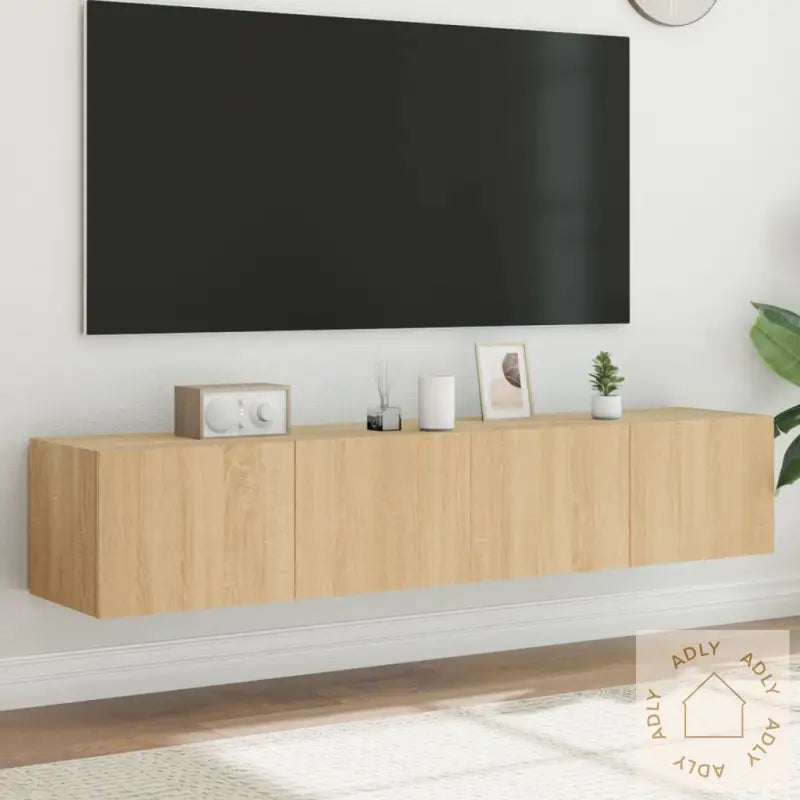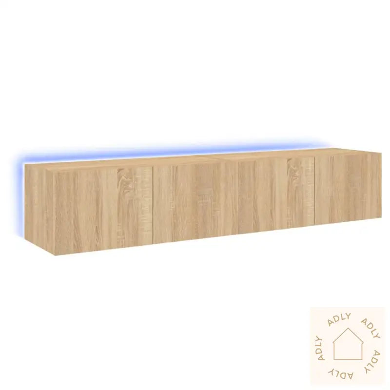 Det konstruerte treverket i sonoma eik gir ikke bare et elegant utseende, men står også for solid kvalitet. Overflaten er glatt, enkel å rengjøre og materialet er både sterkt, stabilt og motstandsdyktig mot fuktighet – perfekt for langvarig bruk i travle hjem.Med RGB LED-lys får du full frihet til å velge hvilken stemning du vil ha i stua eller soverommet. Du kan lett stille inn LED-lyset med ulike farger og overganger via menyen, og lyset fremhever den moderne looken på denne praktiske TV-benken. RGB LED-lys gir møbelet et trendy og unikt uttrykk, samtidig som det skaper en hyggelig atmosfære.TV-enheten har rikelig med lagringsplass: Med to separate rom bak dørene organiserer du enkelt alt fra bøker og magasiner til elektronikkutstyr og fjernkontroller. Alt for at småting skal være samlet og innen rekkevidde, og at hjemmet ser veldig ryddig ut.Fleksibel bruk gjør at skapet passer inn flere steder hjemme – bruk det som vegghengt nattbord, TV-benk eller kombiner flere sammen for å lage en komplett, stilren vegg. Dette gir deg stor frihet til å tilpasse løsningen etter dine behov og ønsker for møbler til hjemmet.Veggmonteringsdesignet betyr at du slipper ben som stjeler plass eller samler støv langs gulvet, og lar deg utnytte plassen maksimalt. Du får et åpent og minimalistisk preg som passer perfekt inn i moderne innredninger. Samtidig gir LED-skapet ekstra lagringsplass akkurat der du trenger det.Godt å vite: